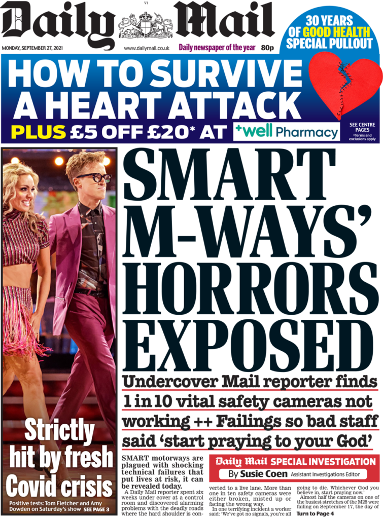 Η Daily Mail δημοσιεύει μια έρευνα για τους έξυπνους αυτοκινητόδρομους. Ένας δημοσιογράφος διαπίστωσε ότι οι δρόμοι “παρουσιάζουν σοβαρές τεχνικές βλάβες που θέτουν σε κίνδυνο τη ζωή των αυτοκινητιστών”, σύμφωνα με την εφημερίδα, με περισσότερες από μία στις 10 κάμερες ασφαλείας να μην λειτουργούν σωστά.