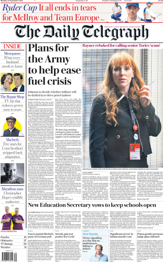 Οι Times επισημαίνουν πως κυβερνητικές πηγές έχουν πει ότι θα χρειαστούν δύο εβδομάδες για να εκδοθούν προσωρινές βίζες σε ξένους εργαζόμενους. Ο πρωθυπουργός μίλησε για έκδοση προσωρινής βίζας σε 5.000 ξένους οδηγούς φορτηγών για να διευκολυνθεί η έλλειψη οδηγών του Ηνωμένου Βασιλείου. Αλλά αυτό το χρονικό πλαίσιο σημαίνει ότι είναι “πολύ πιθανό” οι στρατιώτες να ξεκινήσουν την επιχείρηση Escalin τις επόμενες ημέρες ως έκτακτη ανάγκη, σύμφωνα με την εφημερίδα. Θα χρειαστούν τουλάχιστον μία εβδομάδα για την επαναδιάταξη του προσωπικού από τα τρέχοντα καθήκοντά τους, προσθέτει η εφημερίδα. Εν τω μεταξύ, μια φωτογραφία της Άντζελα Ράινερ εμφανίζεται στην πρώτη σελίδα, καθώς πολλές εφημερίδες σημειώνουν ότι η αναπληρωτής ηγέτης των Εργατικών αποκάλεσε τους Συντηρητικούς “αποβράσματα”.