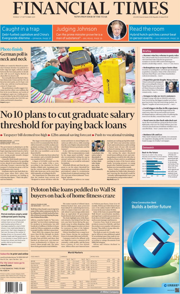 Ασχολούμενοι με άλλο θέμα οι Financial Times, αποκαλύπτουν το όριο των κερδών στο οποίο οι απόφοιτοι αρχίζουν να αποπληρώνουν φοιτητικά δάνεια αναμένεται να μειωθεί. Οι απόφοιτοι αρχίζουν να επιστρέφουν τα φοιτητικά τους δάνεια όταν ο μισθός τους φτάσει τις 27.295 λίρες, ενώ η κυβέρνηση σκέφτεται να το μειώσει. Ένα προτεινόμενο νέο όριο είναι 23.000 λίρες, με το οποίο θα μπορούσε να εξοικονομήσει το Υπουργείο Οικονομικών σχεδόν 2 δισεκατομμύρια λίρες ετησίως, προσθέτει η εφημερίδα, όμως, σημειώνει, τέτοιου είδους προτάσεις θα πλήξουν ξανά τους νέους μετά την αύξηση των εισφορών της Εθνικής Ασφάλισης αυτόν τον μήνα.