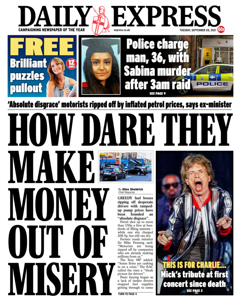 Υπάρχει οργή για ορισμένα πρατήρια καυσίμων που φαίνεται να έχουν διογκώσει τις τιμές εν μέσω συνεχούς υψηλής ζήτησης καυσίμων, αναφέρει η Daily Express. Σύμφωνα με τον πρώην υπουργό Συγκοινωνιών Σερ Mike Penning, «οι αυτοκινητιστές εξαπατώνται» και «ορισμένες εταιρείες εξαργυρώνουν την κρίση». Η εφημερίδα αναφέρει ότι ένα πρατήριο φέρεται να χρεώνει 208,5p το λίτρο την αμόλυβδη βενζίνη, πολύ πιο πάνω από τον μέσο όρο των 136,59p.