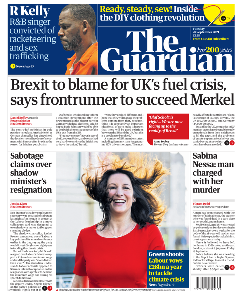 Η Guardian αναφέρει τα σχόλια του Γερμανού πολιτικού που είναι έτοιμος να αντικαταστήσει την Άνγκελα Μέρκελ υποστηρίζοντας ότι το Brexit ευθύνεται για την κρίση καυσίμων του Ηνωμένου Βασιλείου. Ο Olaf Scholz είπε ότι η ελεύθερη κυκλοφορία του εργατικού δυναμικού ήταν μέρος της Ευρωπαϊκής Ένωσης και “δουλέψαμε πολύ σκληρά για να πείσουμε τους Βρετανούς να μην φύγουν”. Η εφημερίδα σημειώνει ότι τα κράτη της Ε.Ε., συμπεριλαμβανομένης της Γερμανίας, έχουν μακροχρόνιες ελλείψεις σε οδηγούς βαρέων οχημάτων.