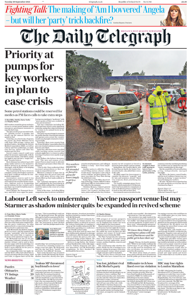 Οι εργαζόμενοι στην υγεία θα έχουν προτεραιότητα στις αντλίες, λέει η Daily Telegraph. Η εφημερίδα αναφέρει ότι το σχέδιο θα διασφαλίσει ότι το προσωπικό θα έχει «προτεραιότητα πρόσβασης» σε συγκεκριμένα προεπιλεγμένα πρατήρια. Αναφέρει επίσης ότι, το συμβούλιο της κομητείας του Surrey ετοιμάζεται να επιβάλει το μέτρο “μονομερώς” επισημαίνοντας την “έκτακτη ανάγκη”. Εν τω μεταξύ, η εφημερίδα αποκαλύπτει ότι η κυβέρνηση ξεκίνησε μια διαβούλευση σχετικά με τις προτάσεις για το “Σχέδιο Β” για την εισαγωγή διαβατηρίων εμβολίων σε χώρους στην Αγγλία.