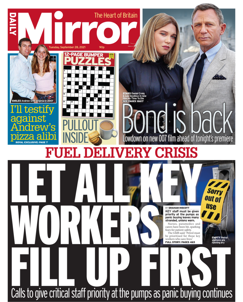 Η Daily Mirror επικεντρώνεται στις αυξανόμενες εκκλήσεις για προτεραιότητα στους εργαζόμενους της υγείας στη βενζίνη, ώστε να προμηθεύονται καύσιμα πρώτοι, ζητεί η εφημερίδα, η οποία τονίζει ότι νοσηλευτές, νοσοκόμοι και φροντιστές θα ωφεληθούν εν μέσω “φόβων για την ασφάλεια των ασθενών”.