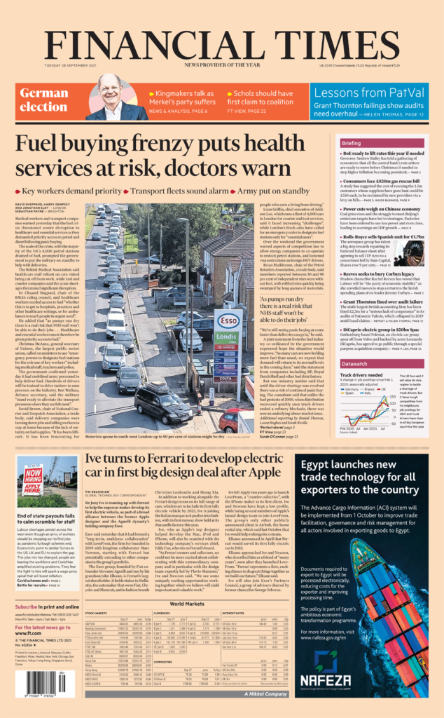 Οι Financial Times αναφέρουν προειδοποιήσεις ότι οι εργαζόμενοι στον τομέα της υγείας θα μπορούσαν να εμποδιστούν να μετακινηθούν στις δουλειές τους εάν συνεχιστεί η κρίση καυσίμων. Η κλιμάκωση της κρίσης έχει ωθήσει τους υπουργούς να θέσουν τον στρατό σε κατάσταση αναμονής και μια καθησυχαστική δήλωση από τις εταιρείες καυσίμων ότι οι ουρές θα αρχίσουν να μειώνονται ήταν «συντονισμένη από την κυβέρνηση». Ο πρόεδρος των ξενοδοχείων Rocco Forte, ο διευθύνων σύμβουλος των εστιατορίων Corbin και King και ο συνιδρυτής του Pret a Manger είναι μεταξύ σχεδόν 70 υπογραφόντων σε επιστολή στους Financial Times, που ζητούν βοήθεια για την έλλειψη προσωπικού στον κλάδο του τουρισμού. Απευθύνουν έκκληση στην κυβέρνηση να επιτρέψει στους εκπαιδευμένους εργαζόμενους να έλθουν στο Ηνωμένο Βασίλειο από το εξωτερικό, λέγοντας ότι ο κρισιμότερος κλάδος της αγοράς είναι σε δυσχερή θέση.