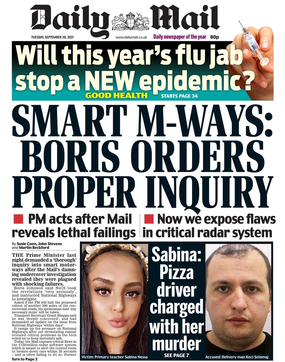 Η Daily Mail γράφει ότι η Andy McDonald, απειλεί να εκτροχιάσει τις προσπάθειες του Sir Keir Starmer να παρουσιάσει τους Εργατικούς ως «ενιαία, έτοιμη να κυβερνήσει δύναμη». Αξιωματούχος των Εργατικών λέει στον Guardian ότι η παραίτηση της σκιώδους γραμματέα εργασίας, McDonald, ήταν μια «προσπάθεια να σαμποτάρει» το συνέδριο του κόμματος. Η εφημερίδα επίσης έχει ένα άλλο θέμα στην πρώτη της σελίδα – καθώς αποκαλύπτει ότι ο πρωθυπουργός διέταξε “σωστή έρευνα” για τους έξυπνους αυτοκινητόδρομους. Η Mail επισημαίνει ότι οι έξυπνοι αυτοκινητόδρομοι «μαστίζονται από σοκαριστικές αστοχίες» και ότι υπάρχουν «κρίσιμα προβλήματα» στην τεχνολογία που χρησιμοποιείται για να βοηθήσει στην αντικατάσταση κακοτεχνιών σε περιοχές με πολυσύχναστους δρόμους.