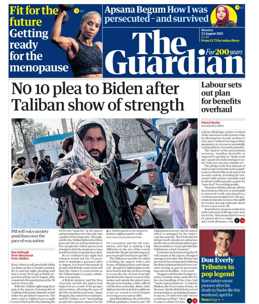 Η Guardian αποκαλύπτει ότι ο Μπόρις Τζόνσον θα ασκήσει προσωπική πίεση στον Αμερικανό πρόεδρο Τζο Μπάιντεν να διατηρήσει τα αμερικανικά στρατεύματα στο αεροδρόμιο της Καμπούλ πέραν της 31 Αυγούστου, προσθέτοντας ότι ήταν ένα Σαββατοκύριακο έντασης μεταξύ Ηνωμένου Βασιλείου και ΗΠΑ. Επισήμανε μάλιστα ότι οι Ταλιμπάν έχουν σφίξει τον κλοιό γύρω από το αεροδρόμιο. Η απόδραση από το Αφγανιστάν συνεχίζει να μετατρέπεται σε μια ταπεινωτική καταστροφή για τις ΗΠΑ, καθώς οι απειλές των επιθέσεων του ISIS και των ομάδων θανάτου των Ταλιμπάν και η αντιφατική καθοδήγηση από τον Λευκό Οίκο ενέτειναν το επικίνδυνο χάος που αντιμετωπίζουν χιλιάδες Αμερικανοί και σύμμαχοι που προσπαθούν να φύγουν η χώρα. Η αμερικανική πρεσβεία ανακοίνωσε το Σάββατο ότι οι Αμερικανοί πολίτες στο Αφγανιστάν πρέπει να μείνουν μακριά από το αεροδρόμιο της Καμπούλ, τη μόνη διέξοδο, συμβουλή που αντικρούει τη δήλωση του Προέδρου Μπάιντεν, πως οι Αμερικανοί να κινηθούν ελεύθερα στο Διεθνές Αεροδρόμιο Hamid Karzai, και έχει επιτευχθεί «συμφωνία» με τους Ταλιμπάν για το θέμα.