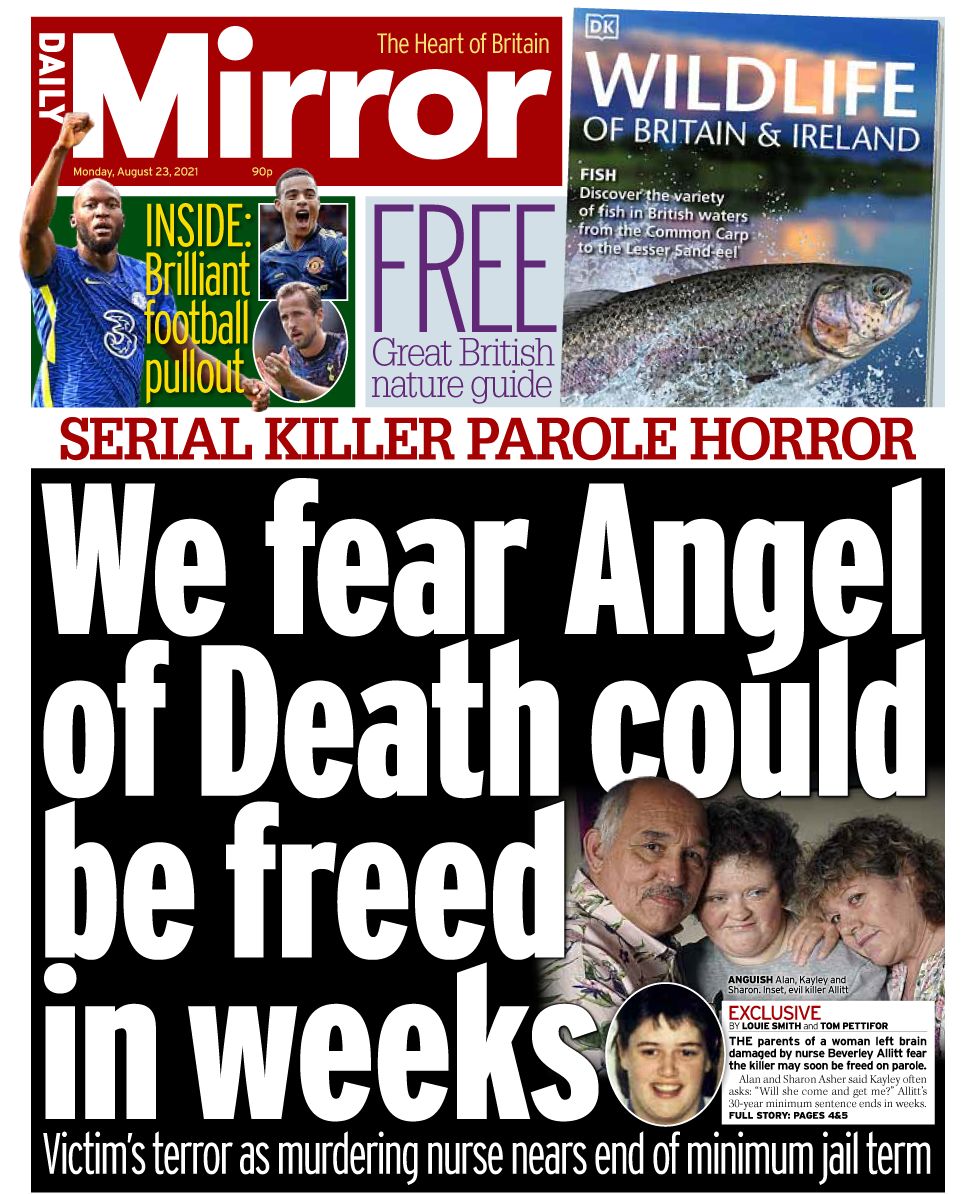 Η Mirror αναφέρει τους γονείς μιας γυναίκας που είχε υποστεί εγκεφαλική βλάβη από τη νοσοκόμα Beverley Allitt, οι οποίοι φοβούνται ότι μπορεί σύντομα να αποφυλακιστεί υπό όρους. Λένε ότι η κόρη τους, τους ρωτάει συνεχώς, “Θα έρθει να με πάρει;” Η Allitt, που είναι γνωστή ως ” Άγγελος του Θανάτου”, καταδικάστηκε για την δολοφονία τεσσάρων παιδιών και τον τραυματισμό άλλων εννέα.