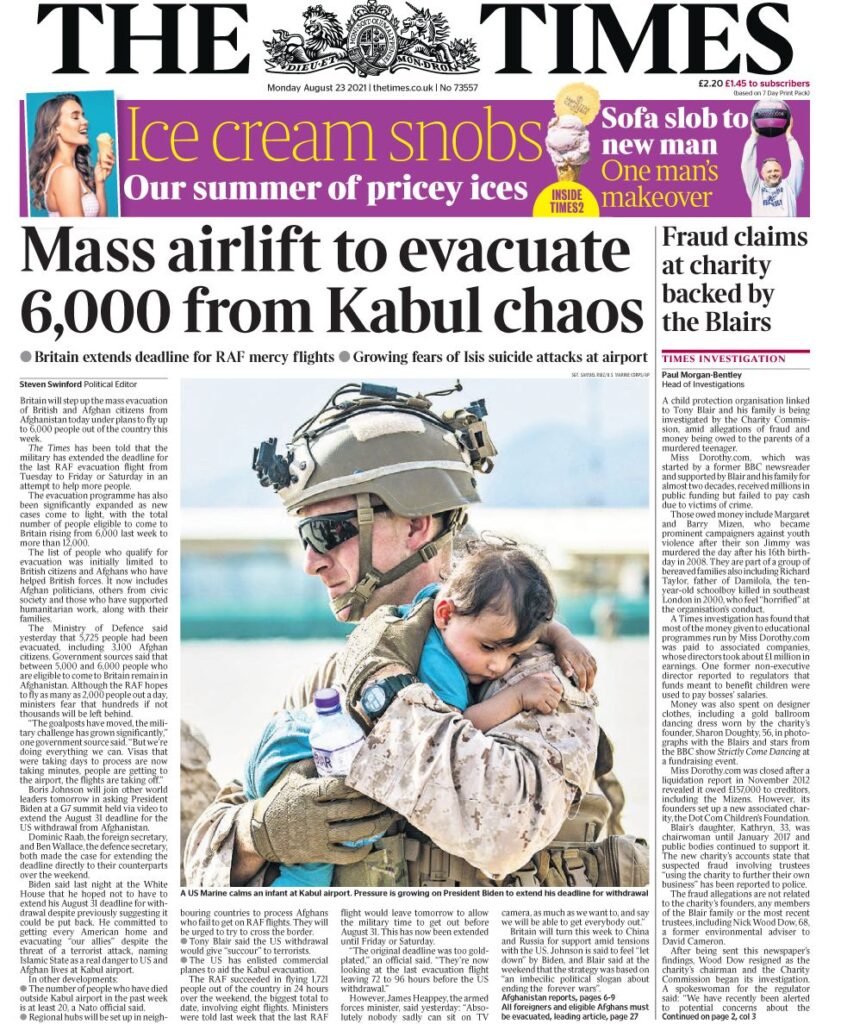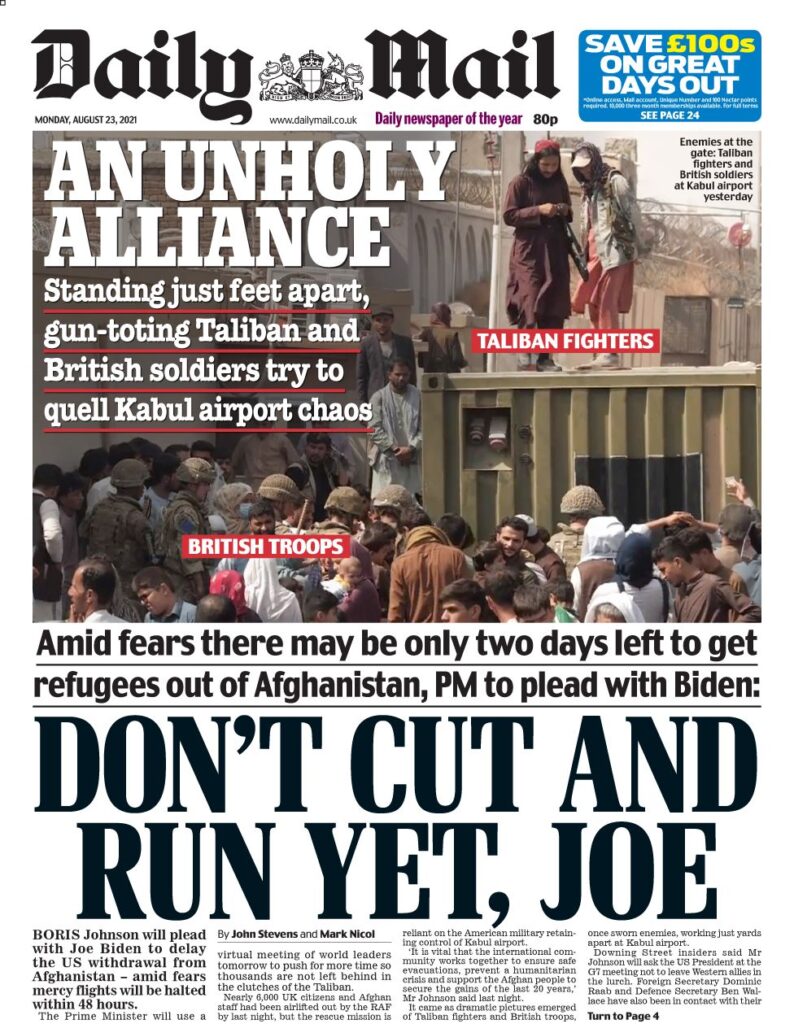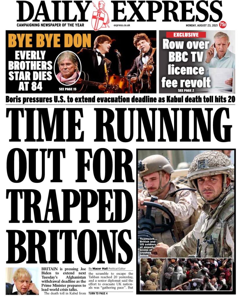 Η Daily Express γράφει ότι ο χρόνος τελειώνει για τους παγιδευμένους Βρετανούς, αλλά επικαλείται έναν ανώτερο διπλωμάτη που λέει ότι η προσπάθεια εκκένωσης των Βρετανών υπηκόων βαδίζει ταχύτατα. Ο υπουργός Ενόπλων Δυνάμεων, James Heappey, παραδέχτηκε ότι το Ηνωμένο Βασίλειο δεν θα είναι σε θέση να σώσει όλους σε όσους έχουν υποσχεθεί καταφύγιο και η επιχείρηση στο αεροδρόμιο της Καμπούλ μπορεί να παραμείνει ανοιχτή μόνο για δύο ακόμη ημέρες.