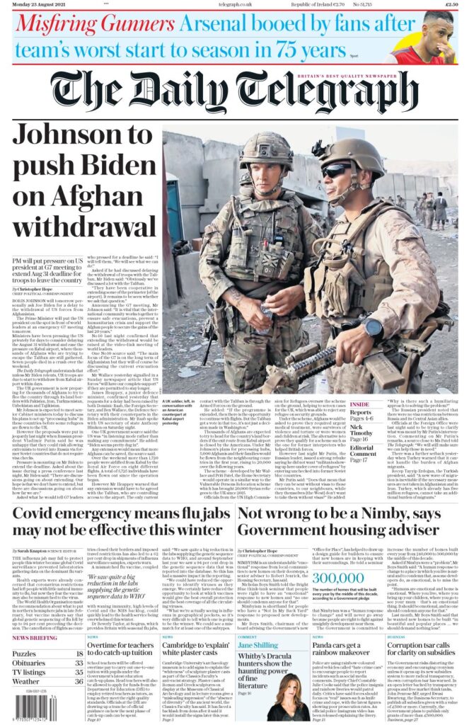 Η Daily Telegraph αναφέρεται στις συνομιλίες μεταξύ του πρωθυπουργού του Ηνωμένου Βασιλείου και του προέδρου των ΗΠΑ και τονίζει ότι εάν ο Μπάιντεν δεν υποχωρήσει, τα βρετανικά στρατεύματα θα αρχίσουν να αποχωρούν από το αεροδρόμιο εντός ημερών. Λέει επίσης, ότι αυξάνεται η πίεση στον πρόεδρο των ΗΠΑ, ο οποίος δήλωσε σε συνέντευξη Τύπου ότι οι συζητήσεις για παράταση συνεχίζονται.