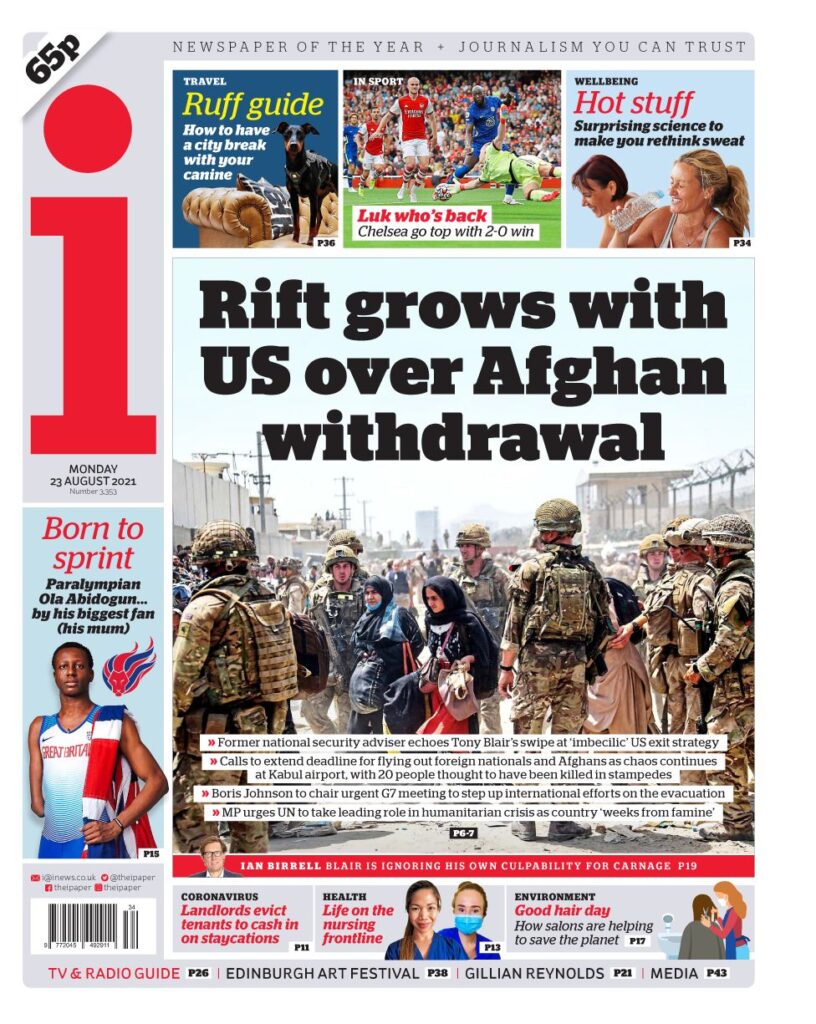 Ο τίτλος της εφημερίδας i είναι “Μεγαλώνει το χάσμα με τις ΗΠΑ για την αποχώρηση από το Αφγανιστάν”, ενώ αναφέρει ότι 20 άνθρωποι πιστεύεται ότι ποδοπατήθηκαν και σκοτώθηκαν, από το χάος που επικρατεί στο αεροδρόμιο της Καμπούλ, καθώς πλήθη Αφγανών συγκεντρώθηκαν έξω από τις πύλες του αεροδρομίου σε μια απέλπιδα προσπάθεια να εγκαταλείψουν τη χώρα. Ενώ το αεροδρόμιο παραμένει υπό τον έλεγχο των ΗΠΑ, η πρόσβαση σε αυτό έχει γίνει απίστευτα επικίνδυνη, με τους μαχητές να δημιουργούν αυθαίρετα σημεία ελέγχου κατά μήκος του δρόμου και να απομακρύνουν ή να επιτίθενται σε όσους επιδιώκουν να περάσουν, αναγκάζοντας τον αμερικανικό στρατό να βρει νέους τρόπους για να οδηγήσει τους ανθρώπους στο αεροδρόμιο, σύμφωνα με πληροφορίες.