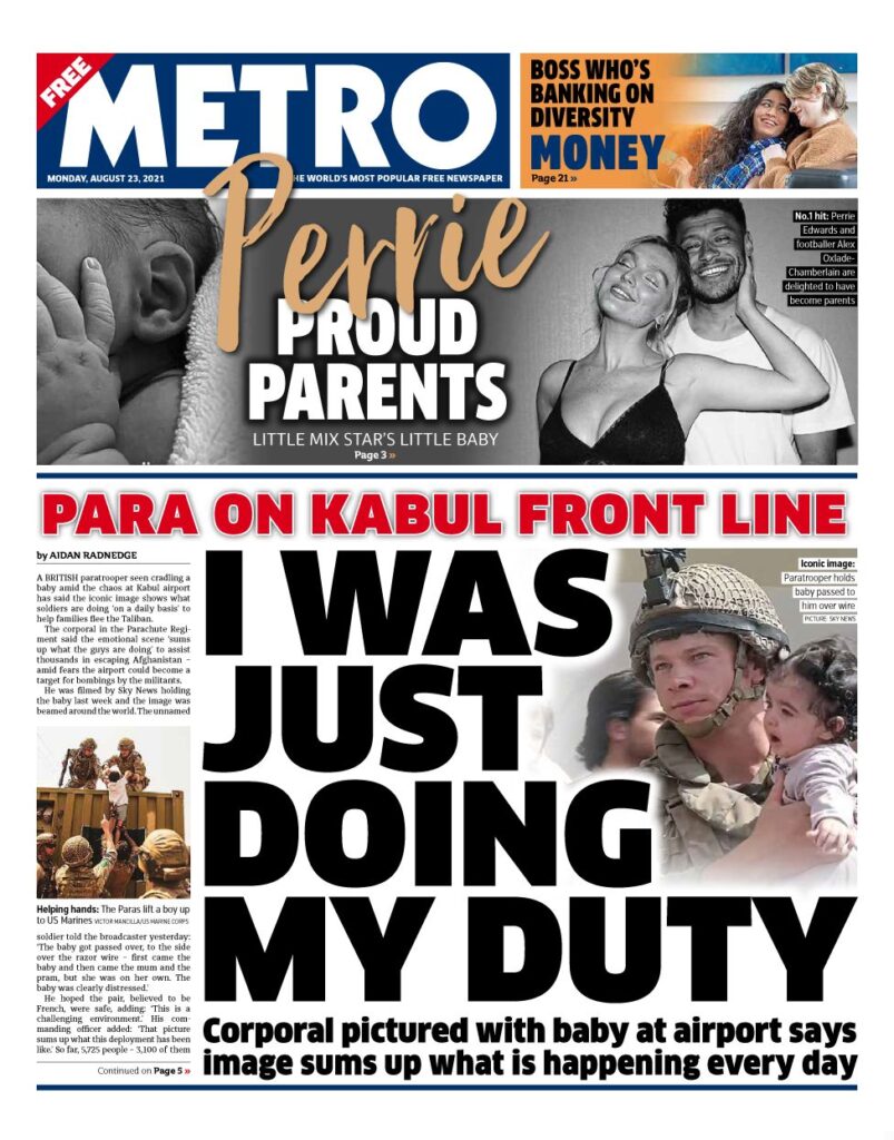 Η Metro έχει την φωτογραφία ενός Βρετανού αλεξιπτωτιστή, ο οποίος εθεάθη να αγκαλιάζει ένα μωρό στο χάος του αεροδρόμιου της Καμπούλ, με τίτλο: “Οι αλεξιπτωτιστές στην πρώτη γραμμή στην Καμπούλ”. Ο άντρας που δεν κατονομάζεται είπε ότι «απλώς έκανε το καθήκον του» και γράφει ότι η φωτογραφία δείχνει τι κάνουν οι στρατιώτες σε καθημερινή βάση. Πιστεύεται ότι τα βρετανικά και ευρωπαϊκά στρατεύματα των Ειδικών Δυνάμεων προσπαθούν να πραγματοποιήσουν αποστολές διάσωσης στην πόλη της Καμπούλ για να μεταφέρουν στο αεροδρόμιο με ασφάλεια Αφγανούς μεταφραστές και τις οικογένειές τους καθώς και αυτούς που δούλευαν για τις δυτικές δυνάμεις, αλλά τα αμερικανικά στρατεύματα έχουν λάβει εντολή να παραμείνουν στο αεροδρόμιο.