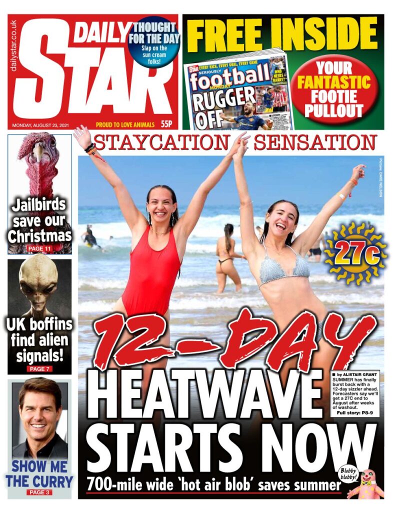 Η Daily Star επιλέγει πιο ευχάριστες ειδήσεις, καθώς λέει ότι θα ξεκινήσει ένας καύσωνας 12 ημερών. “Το καλοκαίρι επέστρεψε τελικά”, γράφει η εφημερίδα, “μετά από εβδομάδες βροχής”.