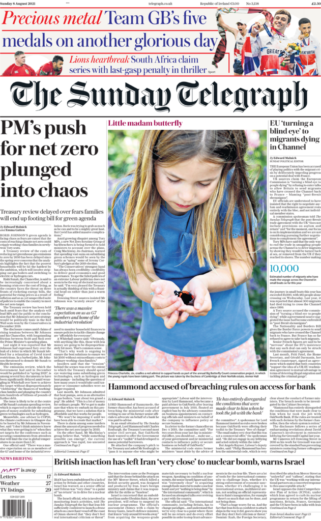 Η Sunday Telegraph αποκαλύπτει σε μια έκθεση για την κλιματική αλλαγή, τον οικονομικό αντίκτυπο των σχεδίων του Μπόρις Τζόνσον για την επίτευξη καθαρών μηδενικών εκπομπών άνθρακα έως το 2050. Η εφημερίδα σημειώνει ότι η αναφορά από το Υπουργείο Οικονομικών για το κόστος του σχεδίου έπρεπε να δημοσιευτεί την άνοιξη, αλλά φέρεται να έχει καθυστερήσει επειδή τα ευρήματά της δείχνουν πως τα φτωχότερα νοικοκυριά θα πληγούν περισσότερο και όλο αυτό έρχεται εν μέσω ισχυρισμών για αυξανόμενες εντάσεις μεταξύ του Τζόνσον και του καγκελαρίου του, Rishi Sunak.