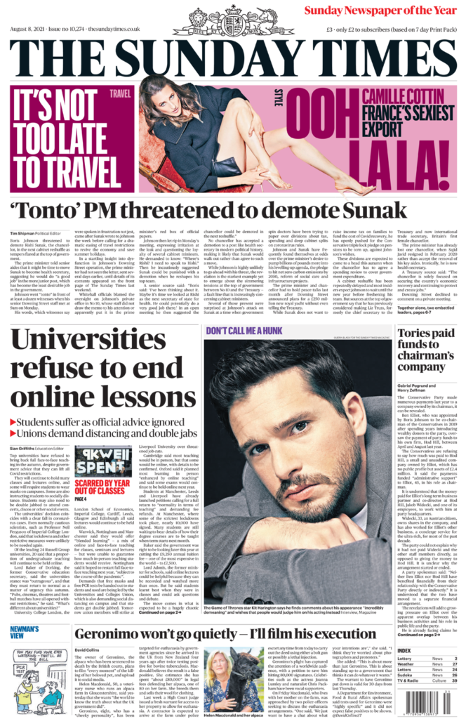 Η σχέση μεταξύ του κ. Τζόνσον και του καγκελαρίου Rishi Sunak, είναι στο πρωτοσέλιδο των Times, που αποκαλύπτουν ότι ο πρωθυπουργός απείλησε να υποβιβάσει τον κ. Sunak στον επόμενο ανασχηματισμό του υπουργικού συμβουλίου “καθώς οι συγκρούσεις φούντωσαν στην κορυφή της κυβέρνησης”. Το κύριο θέμα της εφημερίδας αναφέρει ότι πολλά κορυφαία πανεπιστήμια αρνούνται να επαναφέρουν την πλήρη αυτοπρόσωπη διδασκαλία το φθινόπωρο, παρά το γεγονός ότι δεν θα υπάρχουν περιοριστικά μέτρα κατά του Covid. Πολλά μαθήματα και διαλέξεις θα εξακολουθούν να είναι διαδικτυακά ενώ ορισμένα ιδρύματα απαιτούν μάσκες και μέτρα κοινωνικής απόστασης.