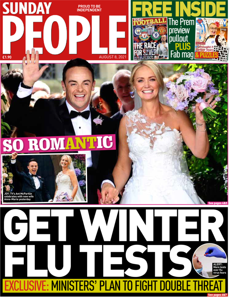 Οι Sunday People αναφέρουν ότι τα κιτ δοκιμών στο σπίτι για τη γρίπη, θα μπορούσαν να ξεκινήσουν αυτόν τον χειμώνα, καθώς οι υπουργοί φοβούνται ότι μπορεί να υπάρξει αύξηση των κρουσμάτων. Επειδή τα συμπτώματα είναι παρόμοια με τον κορονοϊό, οι υπουργοί ανησυχούν ότι οι άνθρωποι θα κάνουν τεστ για την Covid αλλά όχι για την γρίπη και έτσι μπορεί να μην μπουν στον κόπο να αναζητήσουν θεραπεία. Έως και 25.000 άνθρωποι πεθαίνουν κάθε χρόνο από την εποχική γρίπη, προσθέτει η εφημερίδα.