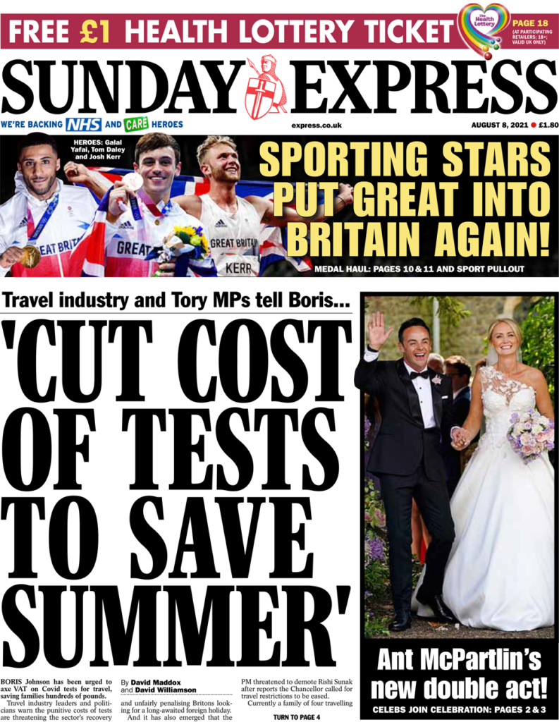 Η Sunday Express ασχολείται με τα καλοκαιρινά ταξίδια, καθώς ο κ. Johnson καλείται να μειώσει το κόστος των υποχρεωτικών τεστ Covid για αυτά, καταργώντας τον ΦΠΑ. Οι υπεύθυνοι του τουριστικού τομέα και οι πολιτικοί λένε ότι το κόστος των ακριβών τεστ, εμποδίζει πολλούς Βρετανούς να κλείσουν διακοπές και εμποδίζουν την ανάκαμψη του τομέα.