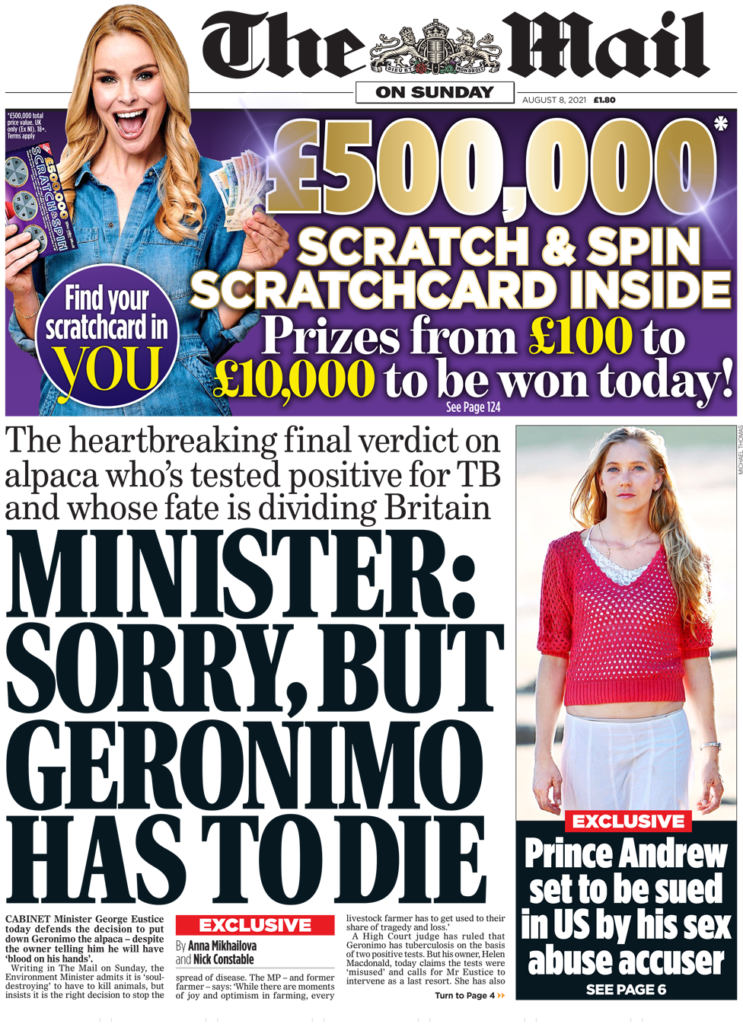 Ο υπουργός Περιβάλλοντος George Eustice γράφει στην Mail, υπερασπιζόμενος την απόφαση της κυβέρνησης να κάνει ευθανασία  σε ένα αλπάκα με το όνομα Geronimo. Ο κ. Eustice γράφει ότι αν και είναι «ψυχοφθόρο» να πρέπει να σκοτώνεις ζώα, είναι η σωστή απόφαση για να σταματήσει η διάδοση των ασθενειών. Είναι ένα θέμα που έχει ευαισθητοποιήσει την καρδιά του έθνους, καθώς το Ανώτατο Δικαστήριο αποφάσισε να θανατώσει τον Geronimo αφού βρέθηκε δύο φορές θετικός στην φυματίωση των βοοειδών, κατά την άφιξή του στο Ηνωμένο Βασίλειο πριν από τέσσερα χρόνια και τώρα αναμένεται να εφαρμοστεί η απόφαση, μέσα σε λίγες ημέρες. Η ιδιοκτήτριά του, Helen MacDonald, αμφισβητεί τα αποτελέσματα και ισχυρίζεται ότι οι εξετάσεις αίματος που σφράγισαν τη μοίρα του, είναι ελαττωματικές. Περισσότεροι από 80.000 άνθρωποι υπέγραψαν ένα ψήφισμα για τη διάσωση του Geronimo, αφού η ιδιοκτήτριά του Helen MacDonald έχασε μια δικαστική μάχη για να σταματήσει το θάνατό του. Και τώρα η Mail αποκαλύπτει ότι οι κυβερνητικοί αξιωματούχοι γνώριζαν τα προβλήματα με τις δοκιμές πριν από πέντε χρόνια, αλλά δεν θα το διερευνήσουν και αρνήθηκαν να εξετάσουν ξανά το ζώο από το 2017. Ωστόσο, σήμερα, η ιδιοκτήτριά του κάνει μια τελευταία έκκληση σε ένα άτομο που μπορεί να αλλάξει γνώμη, ακόμα και στον Πρωθυπουργό, στη σύζυγο του, Carrie Johnson, να τον σώσει. «Απευθύνομαι απευθείας στην Carrie, να ζητήσει από τον πρωθυπουργό να παρέμβει, καθώς είναι προστάτιδα της Ένωσης Προστασίας των Ζώων και έχει κάνει εκστρατεία για το περιβάλλον και την ευημερία των ζώων. Την παρακαλώ ως γυναίκα προς γυναίκα, να κάνει ό, τι μπορεί».