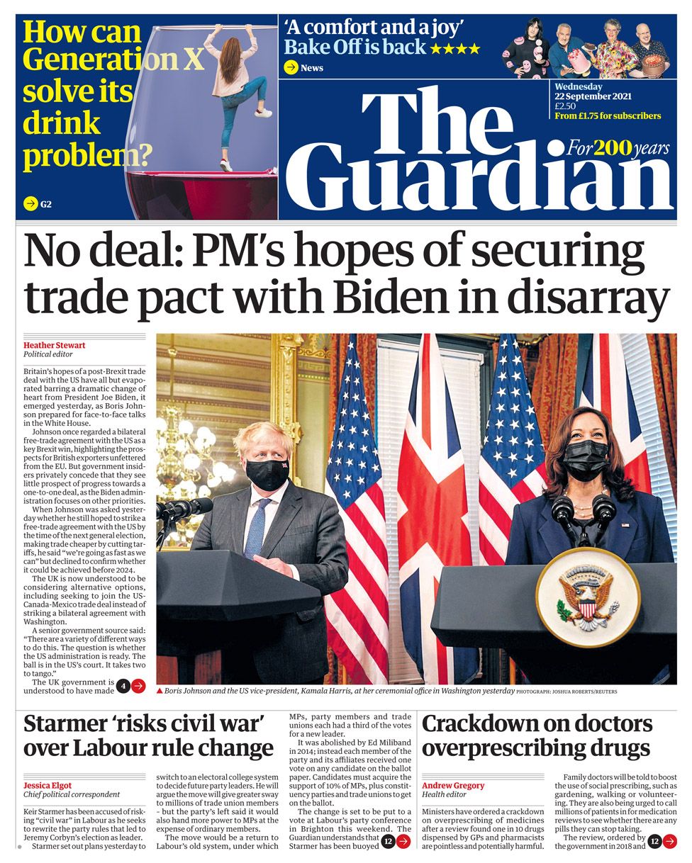 Η Guardian με τον τίτλο «Χωρίς συμφωνία: Οι ελπίδες του πρωθυπουργού να εξασφαλίσει εμπορικό σύμφωνο με τον Μπάιντεν εξασθενούν», σχολιάζει ότι οι ελπίδες της Βρετανίας για μια εμπορική συμφωνία μετά το Brexit με τις ΗΠΑ έχουν περιοριστεί, αποκλείοντας μια θεαματική αλλαγή στάσης από τον Τζο Μπάιντεν, όπως προέκυψε χθες, καθώς ο Μπόρις Τζόνσον προετοιμαζόταν την κατ’ ιδίαν συνομιλία στον Λευκό Οίκο. Ο Τζόνσον θεωρούσε τη διμερή συμφωνία ελεύθερων συναλλαγών με τις ΗΠΑ ως βασική νίκη του Brexit, υπογραμμίζοντας τις προοπτικές για τους Βρετανούς εξαγωγείς χωρίς περιορισμούς από την Ε.Ε. Ωστόσο, οι κυβερνητικοί παράγοντες παραδέχονται ότι βλέπουν ελάχιστες προοπτικές προόδου προς μια συμφωνία, καθώς η κυβέρνηση Μπάιντεν επικεντρώνεται σε άλλες προτεραιότητες. Ο Τζόνσον συναντήθηκε επίσης με την αντιπρόεδρο των ΗΠΑ, Καμάλα Χάρις, στον Λευκό Οίκο και δήλωσε ότι υπήρξε «πραγματική πρόοδος» στο εμπόριο, αναφέροντας την άρση της «περίεργης» απαγόρευσης των ΗΠΑ στις εξαγωγές βρετανικού βοείου κρέατος. Εξήρε επίσης την απόφαση των ΗΠΑ να διπλασιάσουν τη συμβολή τους στη χρηματοδότηση του κλίματος.