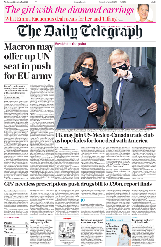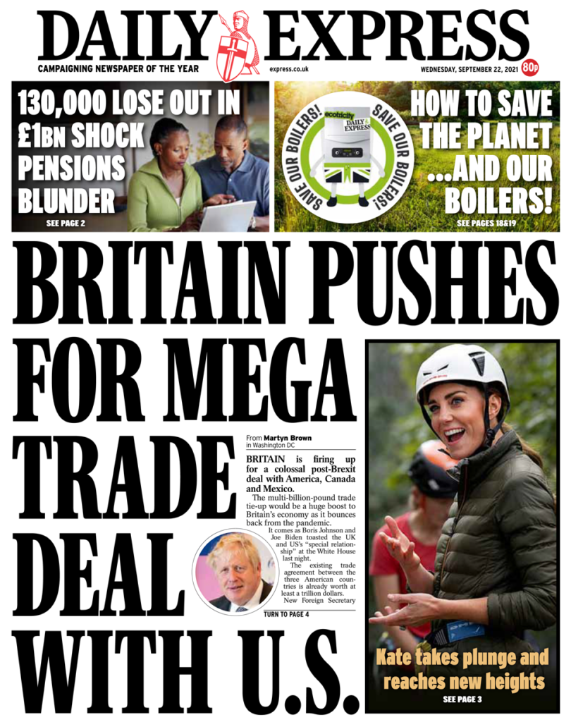Η Daily Telegraph αναφέρει ότι το Ηνωμένο Βασίλειο εξετάζει το ενδεχόμενο ένταξης σε μια εμπορική συμφωνία ΗΠΑ-Μεξικού-Καναδά, καθώς «η ελπίδα εξασθενεί για μια αποκλειστική διμερή συμφωνία με την Αμερική». Η εφημερίδα προσθέτει ότι ο Μπόρις Τζόνσον αρνήθηκε να επιβεβαιώσει ότι η συμφωνία θα μπορούσε να επιτευχθεί έως τις γενικές εκλογές του 2024 στο Ηνωμένο Βασίλειο. Όταν ο Τζόνσον ρωτήθηκε χθες, αν εξακολουθεί να ελπίζει να καταλήξει σε συμφωνία ελεύθερων συναλλαγών ΗΠΑ-Ηνωμένου Βασιλείου μέχρι τις επόμενες γενικές εκλογές, καθιστώντας το εμπόριο φθηνότερο μειώνοντας τους δασμούς, είπε «πάμε όσο πιο γρήγορα μπορούμε». Η υπουργός Εξωτερικών, Liz Truss, που συνοδεύει τον Johnson, είπε ότι ελπίζει να συνδέσει το εμπόριο και τη διπλωματία πιο στενά στο νέο της ρόλο, αναδεικνύοντας τις δυνατότητες για θέσεις εργασίας στο Ηνωμένο Βασίλειο από τη συμφωνία του Aukus.