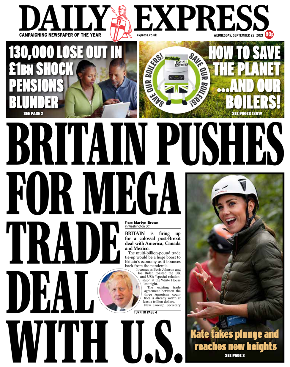 Η Daily Express γράφει ότι η Βρετανία «προετοιμάζεται για μια κολοσσιαία συμφωνία μετά το Brexit», με την Αμερική, τον Καναδά και το Μεξικό, τονίζοντας ότι η εμπορική σύνδεση πολλών δισεκατομμυρίων λιρών θα ήταν μια «τεράστια ώθηση για τη βρετανική οικονομία». Το Ηνωμένο Βασίλειο εξετάζει τώρα εναλλακτικές επιλογές, συμπεριλαμβανομένης της προσπάθειας ένταξης στην εμπορική συμφωνία ΗΠΑ-Καναδά-Μεξικού αντί να επιτύχει διμερή συμφωνία με την Ουάσιγκτον, καθώς μετά την υπογραφή μιας σειράς πρόσφατων διμερών συμφωνιών, η Βρετανία έχει πλέον στενότερες εμπορικές σχέσεις με τον Καναδά ή το Μεξικό παρά με τις ΗΠΑ. Χθες βράδυ ο Μπάιντεν προειδοποίησε τον πρωθυπουργό ότι η ειρήνη στη Βόρεια Ιρλανδία δεν πρέπει τίθεται σε κίνδυνο, διότι δημιουργεί εντάσεις για τους εμπορικούς κανόνες μετά το Brexit, τονίζοντας τη σημασία της διατήρησης της προσεκτικής ισορροπίας που επιτεύχθηκε. Απαντώντας στον Μπάιντεν, ο Τζόνσον είπε: «Είμαστε απολύτως σύμφωνοι, γιατί κανείς δεν θέλει να δει τίποτα που διακόψει ή να διαταράξει τη συμφωνία του Μπέλφαστ ή της Μεγάλης Παρασκευής».