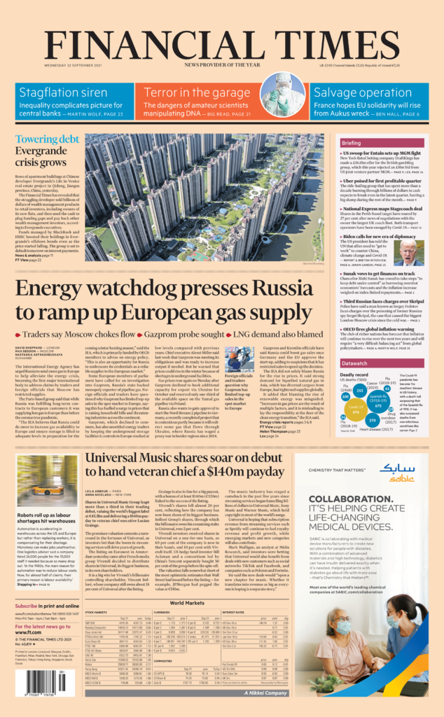 Η συνεχιζόμενη ενεργειακή κρίση κυριαρχεί επίσης στα πρωτοσέλιδα, με τους Financial Times να αναφέρουν ότι ο Διεθνής Οργανισμός Ενέργειας προέτρεψε τη Ρωσία να στείλει περισσότερο φυσικό αέριο στην Ευρώπη για να βοηθήσει στην ανακούφιση των προβλημάτων εφοδιασμού.