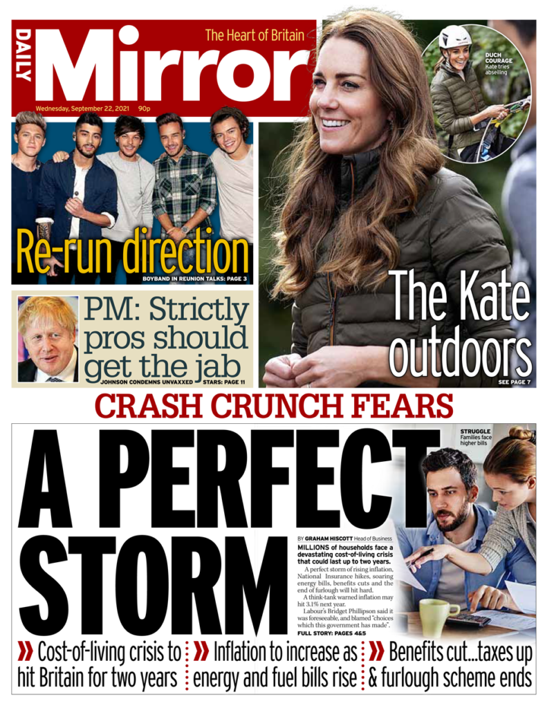 Η Daily Mirror επισημαίνει ότι εκατομμύρια νοικοκυριά αντιμετωπίζουν μια «καταστροφική κρίση κόστους ζωής» που μπορεί να διαρκέσει έως και δύο χρόνια. Αναλυτικά αναφέρει ότι, οι οικογένειες αντιμετωπίζουν μια “τέλεια θύελλα” αυξανόμενου πληθωρισμού, αυξήσεων των Εθνικών Ασφαλίσεων, αυξανόμενων λογαριασμών ενέργειας, περικοπών των επιδομάτων και τέλους της άδεια απουσίας