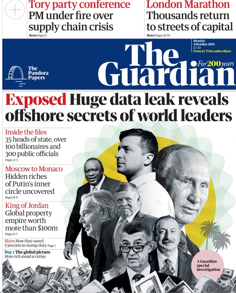 Η Guardian ασχολείται με τη διαρροή και δημοσιεύει 11 σελίδες, βασισμένες στα Pandora Papers, αποκαλύπτοντας συναλλαγές και τον μυστικό πλούτο ηγετών, πολιτικών και δισεκατομμυριούχων. Η τεράστια διαρροή εγγράφων περιλαμβάνει 35 νυν και πρώην πολιτικούς ηγέτες από όλο τον κόσμο και περισσότερους από 300 υπουργούς, δικαστές και στρατηγούς καθώς και φορολογικούς παραδείσους όπως το Μονακό, ο Παναμάς και η Ελβετία. Μεταξύ των ονομάτων που ήρθαν στο φως, είναι και περισσότερα από 130 πρόσωπα που αναφέρονται ως δισεκατομμυριούχοι στην λίστα του περιοδικού Φορμπς. Η εφημερίδα σημειώνει ότι τα έγγραφα ανοίγουν παράθυρο στην “παγκόσμια υπεράκτια οικονομία” που επιτρέπει σε μερικούς από τους πλουσιότερους ανθρώπους στον κόσμο να πληρώνουν ελάχιστο ή καθόλου φόρο. Επισημαίνει ότι έχει αναλυθεί μόνο ένα “απειροελάχιστο κομμάτι” των δεδομένων που έχουν διαρρεύσει. Έτσι οι αποκαλύψεις που δημοσιεύθηκαν από την Guardian και άλλα έντυπα μέχρι τώρα, αντιπροσωπεύουν μόνο σταγόνες στον ωκεανό. Μεταξύ των αποκαλύψεων είναι το πώς ο Βασιλιάς της Ιορδανίας συγκέντρωσε κρυφά 70 εκατομμύρια λίρες, ο σύνδεσμος του Ρώσου προέδρου Βλαντιμίρ Πούτιν με μυστικά περιουσιακά στοιχεία στο Μονακό και πώς ο πρώην Βρετανός πρωθυπουργός Τόνι Μπλερ και η σύζυγός του εξοικονόμησαν πάνω από 300.000 λίρες κατά την αγορά αρχοντικού του Λονδίνου, αξίας 6,45 εκατομμυρίων λιρών.