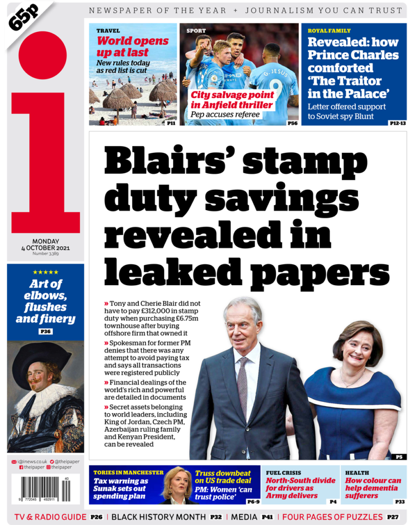 Η εφημερίδα i γράφει ότι ένας εκπρόσωπος του Μπλερ αρνήθηκε ότι υπήρξε οποιαδήποτε προσπάθεια αποφυγής πληρωμής φόρου, προσθέτοντας ότι όλες οι συναλλαγές καταχωρήθηκαν δημόσια. Ο πρώην πρωθυπουργός είχε επικρίνει στο παρελθόν τα φορολογικά κενά. Τα στοιχεία που προέκυψαν από τη μελέτη των Pandora Papers, έδωσε χθες στη δημοσιότητα η Διεθνής Κοινοπραξία Ερευνητών Δημοσιογράφων. Ο τεράστιος όγκος εγγράφων, που προήλθαν από δεκατέσσερις τράπεζες και εταιρίες χρηματοπιστωτικών συναλλαγών ξεπερνά κατά πολύ το μέγεθος, των στοιχείων, της έρευνας και των αποκαλύψεων των διαβόητων Panama Papers. Η έρευνα πραγματοποιήθηκε από περίπου 650 δημοσιογράφους που δραστηριοποιούνται σε 117 χώρες και φέρνει στο φως στοιχεία για εκατοντάδες πολιτικούς και κυβερνώντες, παγκοσμίως και τις «περίεργες» συναλλαγές τους με υπεράκτιες εταιρίες (off shore). Η έδρα των περισσοτέρων εταιριών είναι σε Ελβετία, Κύπρο, Σιγκαπούρη, Μπελίζ και Βρετανικές Παρθένες Νήσους, αλλά το σύνολο των φακέλων έχει προέλθει από μία και μόνη νομική εταιρία που εμπλέκεται στο σύστημα απόκρυψης πόρων. Ηλεκτρονική αλληλογραφία, εκτενείς πίνακες, ιδιωτικά μυστικά συμβόλαια και διαβαθμισμένα εσωτερικά έγγραφα των εταιριών και τραπεζών αυτών έρχονται για πρώτη φορά στο φως.