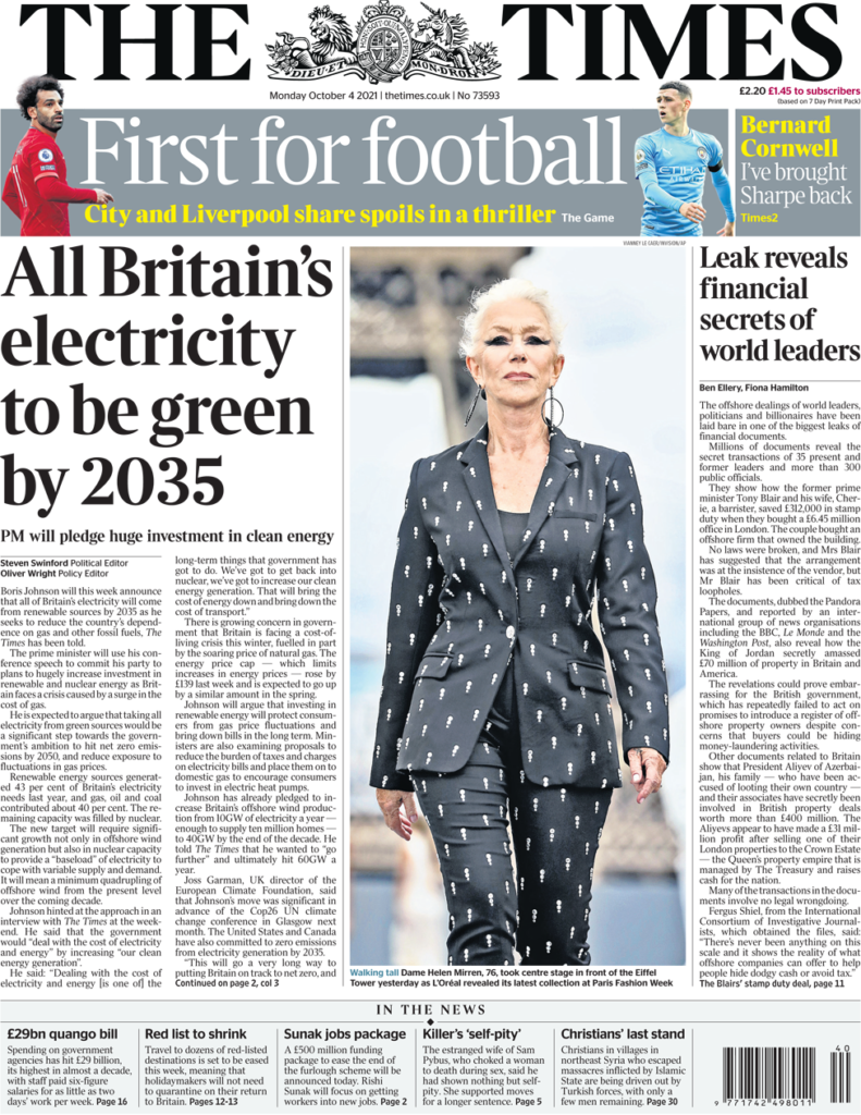 Οι Times σημειώνουν ότι οι αποκαλύψεις από τα Pandora Papers θα μπορούσαν να είναι ντροπιαστικές για τη βρετανική κυβέρνηση, η οποία «επανειλημμένα απέτυχε να τηρήσει τις υποσχέσεις της για τη θέσπιση μητρώου ιδιοκτητών υπεράκτιων ακινήτων παρά τις ανησυχίες ότι οι αγοραστές μπορεί να κρύβουν δραστηριότητες ξεπλύματος χρήματος». Εν τω μεταξύ, ο Μπόρις Τζόνσον θα ανακοινώσει αργότερα αυτήν την εβδομάδα ότι όλη η ηλεκτρική ενέργεια της Βρετανίας θα προέρχεται από ανανεώσιμες πηγές, χαμηλών εκπομπών άνθρακα, έως το 2035, σύμφωνα με τους Times. Ο πρωθυπουργός θα αποκαλύψει περισσότερες λεπτομέρειες όταν μιλήσει στη συνδιάσκεψη του Συντηρητικού Κόμματος, προσθέτει η εφημερίδα. Λέει επίσης ότι, ο πρωθυπουργός θα αξιοποιήσει την ομιλία του στη διάσκεψη για να δεσμεύσει το κόμμα του σε σχέδια για “τεράστια αύξηση” των επενδύσεων σε ανανεώσιμες πηγές και πυρηνική ενέργεια. Ένας εμπειρογνώμονας για το κλίμα λέει στην εφημερίδα ότι “θα προχωρήσει πολύ για να θέσει τη Βρετανία σε καλό δρόμο στο καθαρό μηδέν”. Αρκετές εργασίες περιλαμβάνουν ανακοινώσεις που αναμένονται τις επόμενες ημέρες από το συνέδριο στο Manchester.
