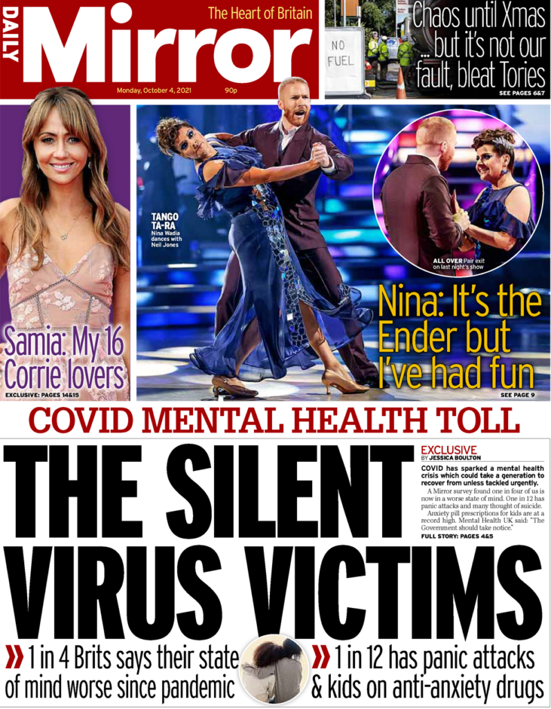 Το πρωτοσέλιδο της Daily Mirror περιλαμβάνει μια έκθεση για τον αντίκτυπο που είχε η πανδημία στην ψυχική υγεία των ανθρώπων. Μια έρευνα από την εφημερίδα διαπίστωσε ότι ένας στους τέσσερις είναι σε χειρότερη πνευματική κατάσταση από ό, τι πριν από την πανδημία, με έναν στους 12 να λέει ότι βιώνει κρίσεις πανικού. Οι συνταγές αγχολυτικών χαπιών για παιδιά είναι επίσης αυξημένες, φτάνοντας στο υψηλότερο σημείο από ποτέ, προσθέτει η εφημερίδα. Η εφημερίδα το περιγράφει ως “κρίση ψυχικής υγείας” από την οποία “θα χρειαστεί μια γενιά για να αναρρώσει”, ενώ προτείνει περισσότερη χρηματοδότηση για υπηρεσίες ψυχικής υγείας και λέει ότι πρέπει επίσης να εξεταστεί ο ρόλος των κοινωνικών μέσων μαζικής ενημέρωσης, του χώρου εργασίας και του εκπαιδευτικού συστήματος.