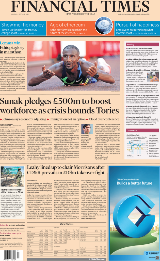 Το βασικό θέμα των Financial Times αναφέρεται στο πακέτο υποστήριξης ύψους 500 εκατομμυρίων λιρών του κ. Sunak, το οποίο θα απευθύνεται σε όσους εγκαταλείπουν το πρόγραμμα απολύσεων και σε μεγαλύτερους σε ηλικία εργαζόμενους. Η εφημερίδα σημειώνει ότι η ανακοίνωση έρχεται καθώς η κυβέρνηση προσπαθεί να αντιμετωπίσει τις τεράστιες ελλείψεις εργατικού δυναμικού που έχουν πλήξει ορισμένους τομείς μετά το Brexit. Ο Τζόνσον αρνήθηκε να κλείσει τις τρύπες στην αγορά εργασίας ενισχύοντας τη μετανάστευση, προσθέτει η εφημερίδα, με τον πρωθυπουργό να λέει ότι η οικονομία διέρχεται μια «περίοδο προσαρμογής». Οι Financial Times αναφέρονται και σε έναν άλλο υπουργό που σκέφτεται να ασχοληθεί με μια άλλη κυβερνητική δέσμευση, τον υπουργό Μεταφορών Grant Shapps, ο οποίος λέγεται ότι “σκέφτεται την επανεξέταση του HS2”. Ο κ. Shapps λέει στην εφημερίδα ότι οι υπουργοί δεν μπορούν πλέον να «ακολουθούν τυφλά» το αρχικό σχέδιο για τη σιδηροδρομική γραμμή, κάτι που σύμφωνα με την εφημερίδα σημαίνει ότι το ανατολικό σκέλος από το Birmingham στο Leeds Λιντς «κινδυνεύει».