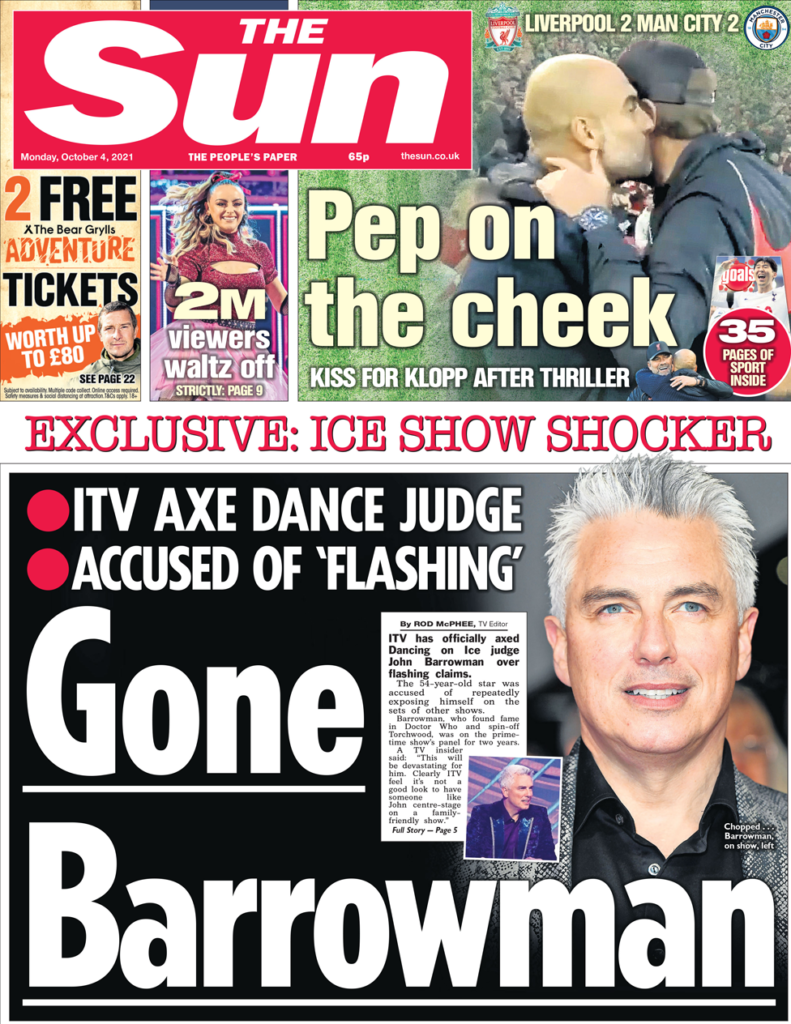 Η Sun αποκαλύπτει ότι ο John Barrowman έχει «κοπεί» από την ITV ως κριτής στο Dancing on Ice μετά από κατηγορίες ότι επανειλημμένα εξέθεσε απρεπώς τον εαυτό του στα γυρίσματα άλλων ψυχαγωγικών εκπομπών, ενώ ήταν στο πάνελ της συγκεκριμένης εκπομπής για δύο χρόνια.