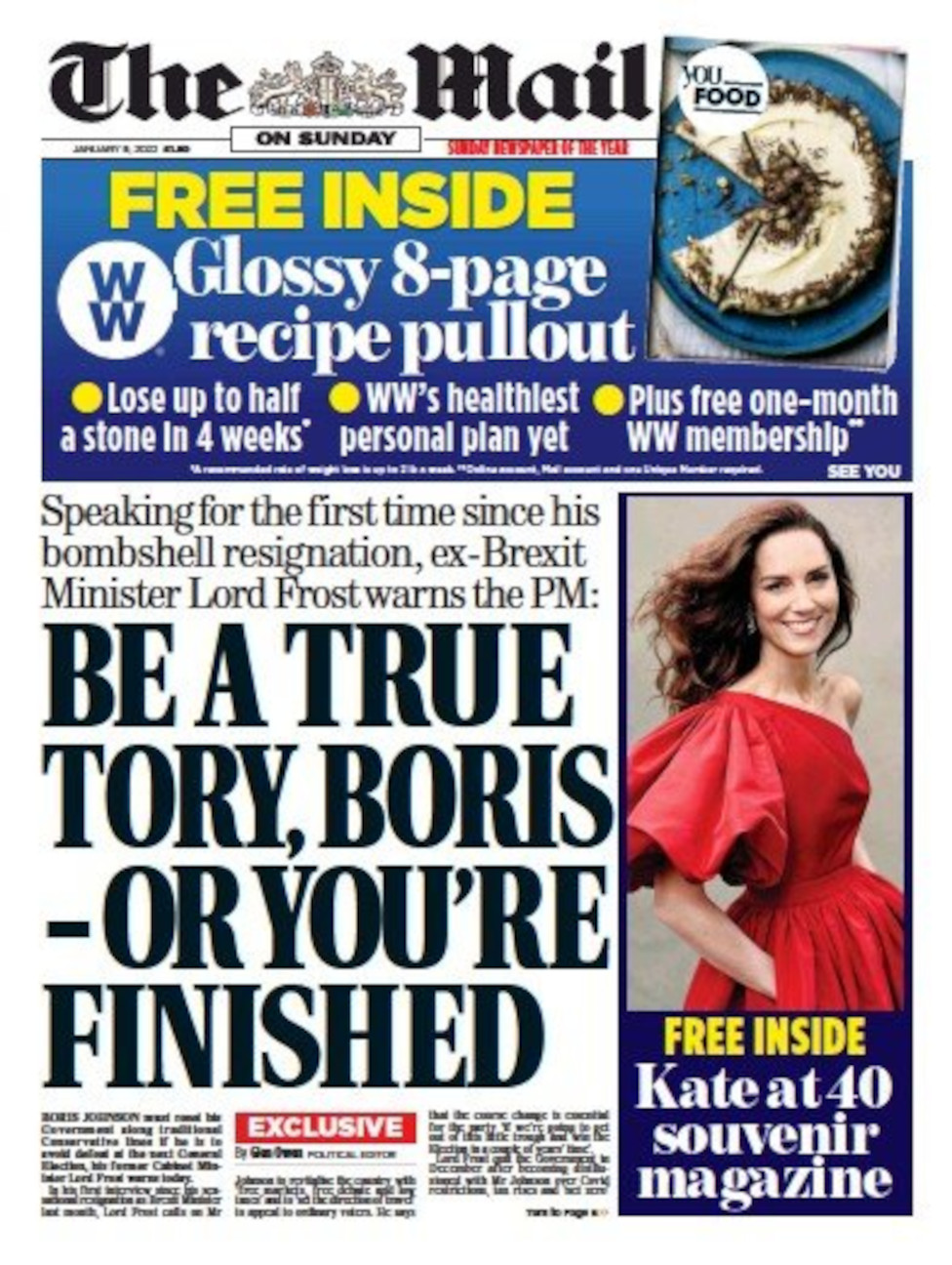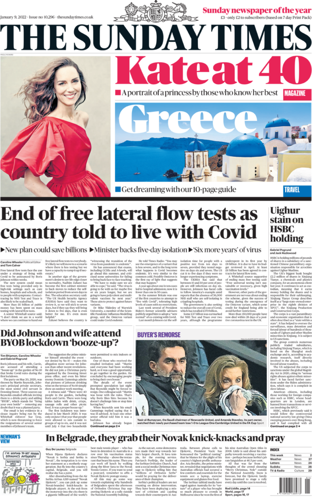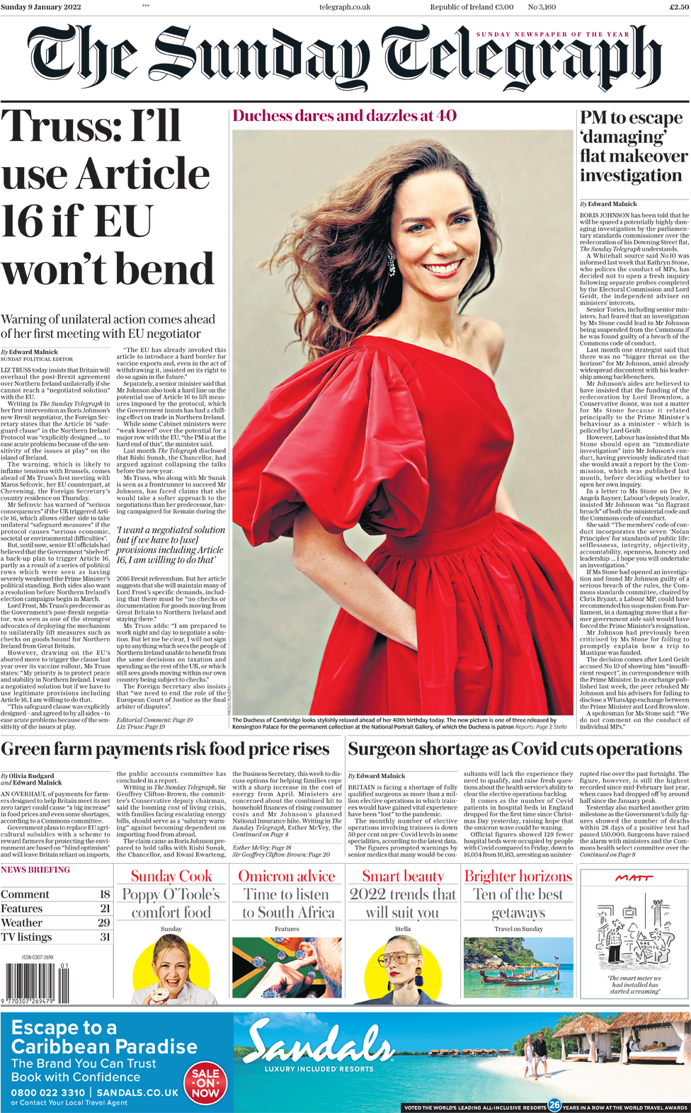 Γράφοντας στην Sunday Telegraph, η υπουργός Εξωτερικών Liz Truss είπε ότι η κυβέρνηση θα ενεργοποιήσει μονομερώς το Άρθρο 16 του Πρωτοκόλλου της Βόρειας Ιρλανδίας εάν δεν μπορεί να καταλήξει σε μια «λύση μέσω διαπραγματεύσεων» με την Ευρωπαϊκή Ένωση. Η ρήτρα είναι η διάταξη του Πρωτοκόλλου -διέπει τις εμπορικές ρυθμίσεις μετά το Brexit για τη Βόρεια Ιρλανδία- που μπορεί να ανασταλεί από κάθε πλευρά εάν προκαλούν σοβαρές δυσκολίες. Μέχρι τώρα, προσθέτει η εφημερίδα, ανώτεροι αξιωματούχοι της Ευρωπαϊκής Ένωσης πίστευαν ότι η κυβέρνηση είχε «εναποθέσει» ένα σχέδιο για την ενεργοποίηση του Άρθρου 16, εν μέρει λόγω των πρόσφατων πολιτικών διενέξεων που θεωρούνταν ότι είχαν αποδυναμώσει σοβαρά τη θέση του πρωθυπουργού. Η εφημερίδα σημειώνει ότι η προειδοποίηση πιθανότατα «θα πυροδοτήσει εντάσεις με τις Βρυξέλλες» ενόψει της πρώτης συνάντησης της κας Truss με τον ομόλογό της στην Ευρωπαϊκή Ένωση την Πέμπτη. Εν τω μεταξύ, μια φωτογραφία της Δούκισσας του Cambridge με κόκκινο φόρεμα δημοσιεύεται σε αυτήν  και σε πολλές άλλες εφημερίδες. Είναι μία από τις τρεις φωτογραφίες που κυκλοφόρησε το Παλάτι του Kensington για να τιμήσει τα 40α γενέθλιά της. Η Sunday Telegraph σημειώνει ότι οι τρεις φωτογραφίες – μία έγχρωμη και οι  άλλες δυο ασπρόμαυρες – δείχνουν τις αντίθετες πλευρές της δούκισσας, από το φιλικό χαμόγελο μιας γλυκιάς μητέρας μέχρι την πιο επίσημη πόζα μιας μελλοντικής βασίλισσας.