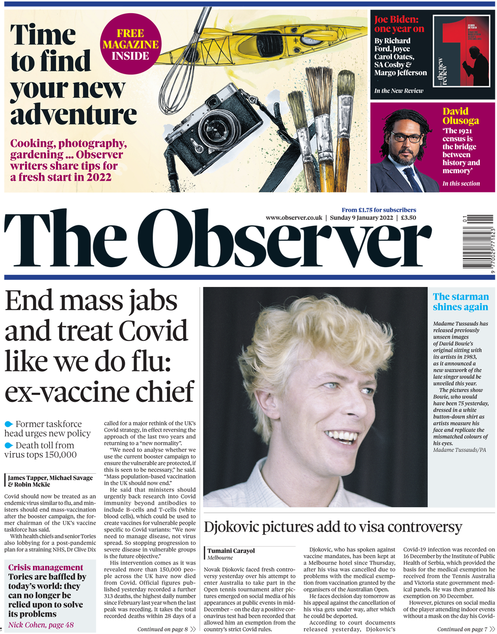 Παρόμοιος και ο τίτλος του Observer: «Τερματίστε τα μαζικά εμβόλια και αντιμετωπίστε τον Covid ως ενδημικό ιό, παρόμοιο με τη γρίπη». Η εφημερίδα αναφέρει ότι ο πρώην πρόεδρος της ομάδας εργασίας για τα εμβόλια του Ηνωμένου Βασιλείου, Δρ. Clive Dix, ζήτησε την επανεξέταση της στρατηγικής για τον Covid, ουσιαστικά, αντιστρέφοντας την προσέγγιση των τελευταίων δύο ετών και επιστρέφοντας σε μια «νέα κανονικότητα». Ο Δρ. Clive Dix είπε: «Ο μαζικός εμβολιασμός βάσει πληθυσμού στο Ηνωμένο Βασίλειο πρέπει τώρα να τελειώσει». Είπε επίσης ότι είναι καιρός «να διαχειριστούμε τις ασθένειες και όχι την εξάπλωση του ιού», με κύριο στόχο να σταματήσουμε την εξάπλωση σοβαρών ασθενειών σε ευάλωτες ομάδες. Αυτό θα σήμαινε τερματισμό του μαζικού εμβολιασμού μετά την αναμνηστική εκστρατεία και δημιουργία εμβολίων μόνο για ευάλωτα άτομα, ειδικά για παραλλαγές του Covid. Εν τω μεταξύ το Ηνωμένο Βασίλειο έφτασε στο ζοφερό ορόσημο των 150.000 θανάτων από Covid.