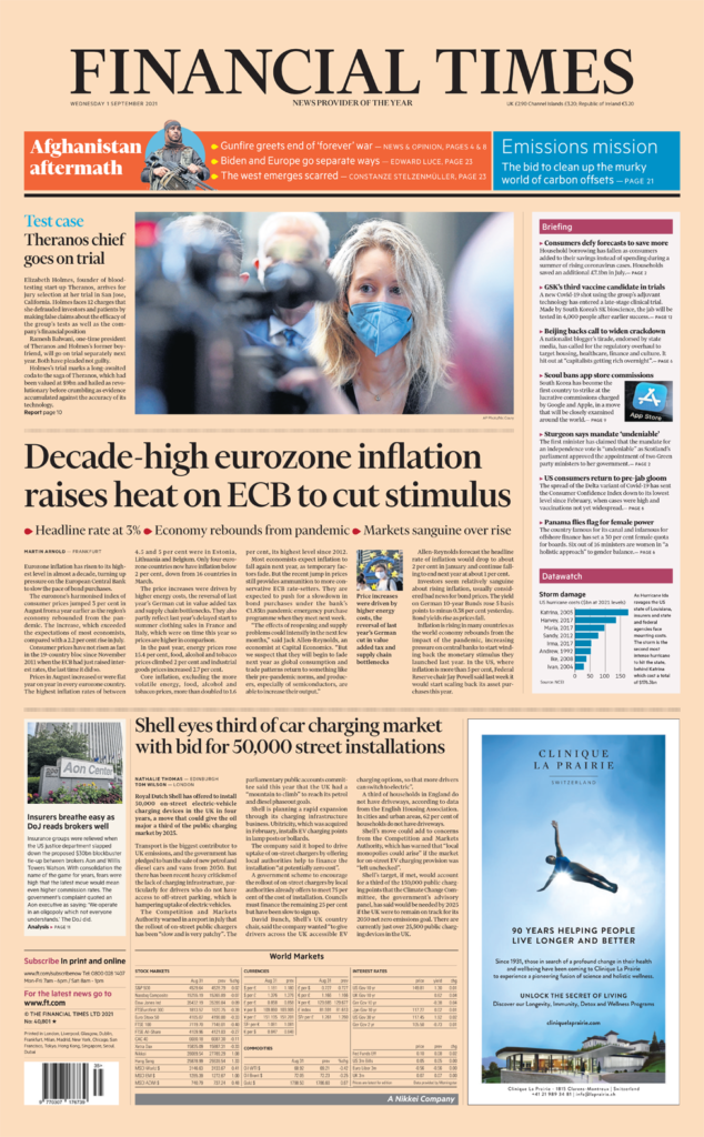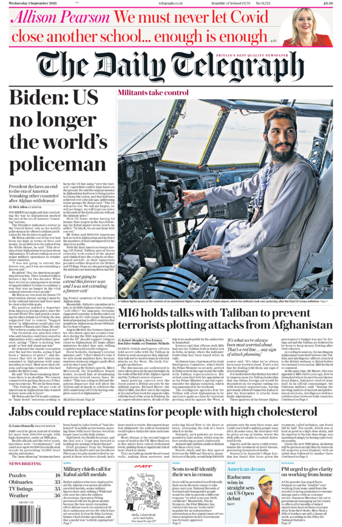 Η Telegraph αναφέρεται στα σχόλια του προέδρου Joe Biden, ο οποίος είπε ότι η στιγμή σηματοδοτεί το τέλος μιας εποχής στρατιωτικών επιχειρήσεων. Η εφημερίδα ερμηνεύει τις παρατηρήσεις του ως ένδειξη “υποχώρησης των Ηνωμένων Πολιτειών από το ρόλο τους ως αστυνομικού του κόσμου”. Η Telegraph δείχνει έναν μαχητή των Ταλιμπάν να ποζάρει στο πιλοτήριο ενός εγκαταλελειμμένου αεροσκάφους του αφγανικού στρατού. Σύμφωνα με την Telegraph, μια θεραπεία με τη χρήση ενός νέου φαρμάκου, βρέθηκε να μειώνει στο μισό τα επίπεδα της «κακής χοληστερόλης» σε μόλις δύο εβδομάδες, πράγμα που σημαίνει ότι όσοι πάσχουν από καρδιακές παθήσεις δεν θα χρειάζεται πλέον να λαμβάνουν στατίνες καθημερινά.