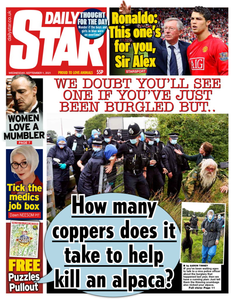 Η Sun αποκαλύπτει ότι η «αντιπαράθεση των 26 ημερών» για το Geronimo το αλπακά κατέληξε σε «δυστυχία», με το ζώο να θανατώνεται από κυβερνητικούς αξιωματούχους αφού βρέθηκε θετικό στη φυματίωση βοοειδών. Η εφημερίδα αναφέρει ότι οι υποστηρικτές της εκστρατείας για τη διάσωσή του συγκρούστηκαν με την αστυνομία και μια γυναίκα συνελήφθη καθώς το αλπακά απομακρύνθηκε από την μάντρα του. “Geroni-no!” είναι ο τίτλος της Sun.