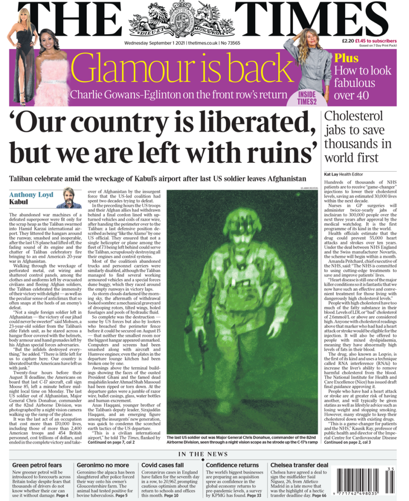 Ο ανταποκριτής των Times στην Καμπούλ, Anthony Loyd, περιγράφει τη σκηνή στο αεροδρόμιο, σημειώνοντας πως τα εγκαταλελειμμένα οπλικά συστήματα μιας ηττημένης υπερδύναμης ήταν κατάλληλα μόνο για το παλιοσίδερα, καθώς οι μαχητές των Ταλιμπάν συρρέουν στο αεροδρόμιο και πανηγυρίζουν ανάμεσα στα συντρίμμια που άφησαν πίσω τους τα αμερικανικά στρατεύματα. Σημειώνει ότι οι μαχητές είναι χαρούμενοι με τη νίκη, αν και το μεγαλύτερο μέρος του αμερικανικού στρατιωτικού εξοπλισμού καταστράφηκε από τις δυνάμεις πριν αποσυρθούν και δεν λειτουργεί πλέον. Ένας στρατιώτης των Ταλιμπάν φέρεται να είπε στην εφημερίδα: «Έχουμε λίγα πράγματα να πάρουμε από εδώ. Η χώρα μας απελευθερώθηκε, αλλά οι Αμερικανοί μας άφησαν σκουπίδια». Η κύρια φωτογραφία στην πρώτη σελίδα της εφημερίδας είναι αυτή του Υποστράτηγου Chris Donahue, ο οποίος ήταν ο τελευταίος Αμερικανός στρατιώτης που επιβιβάστηκε σε πτήση από το Αφγανιστάν.