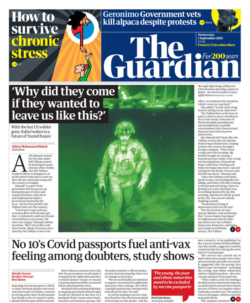 Η Guardian, εστιάζει στις εμπειρίες των απλών Αφγανών που φοβούνται για το μέλλον τους υπό τους Ταλιμπάν. Μια νεαρή γυναίκα λέει στην εφημερίδα ότι αφού οι μαχητές κατέλαβαν την πόλη της και πέρασε την πρώτη της μέρα υπό τον πλήρη έλεγχο των Ταλιμπάν, έχασε τη δουλειά της στο τελωνείο αφού ζήτησαν από αυτήν και πολλές γυναίκες συναδέλφους της να φύγουν. «Ένας άντρας με μακριά γένια κάθεται στην καρέκλα μου τώρα», λέει στην εφημερίδα. Προσθέτει επίσης, ότι ο αδερφός της, της αγόρασε μπούρκα και έκαψε τα τζιν της και όποια άλλα ρούχα μπορεί να μην είναι πλέον αποδεκτά. “Όλα τελείωσαν για μένα σήμερα το πρωί”, λέει. “Έκαψα και τις ελπίδες μου μαζί τους”.