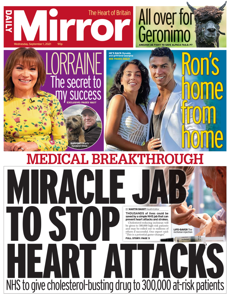 Η Daily Mirror ασχοελίται με ένα νέο «θαύμα», το οποίο λέει ότι θα μπορούσε να σώσει χιλιάδες ζωές αποτρέποντας καρδιακές προσβολές και εγκεφαλικά. Το inclisiran που μειώνει τη χοληστερόλη θα χορηγηθεί σε 300.000 ασθενείς υψηλού κινδύνου και μπορεί να χορηγηθεί σε εκατομμύρια άλλους εάν είναι επιτυχές, αναφέρει η εφημερίδα.