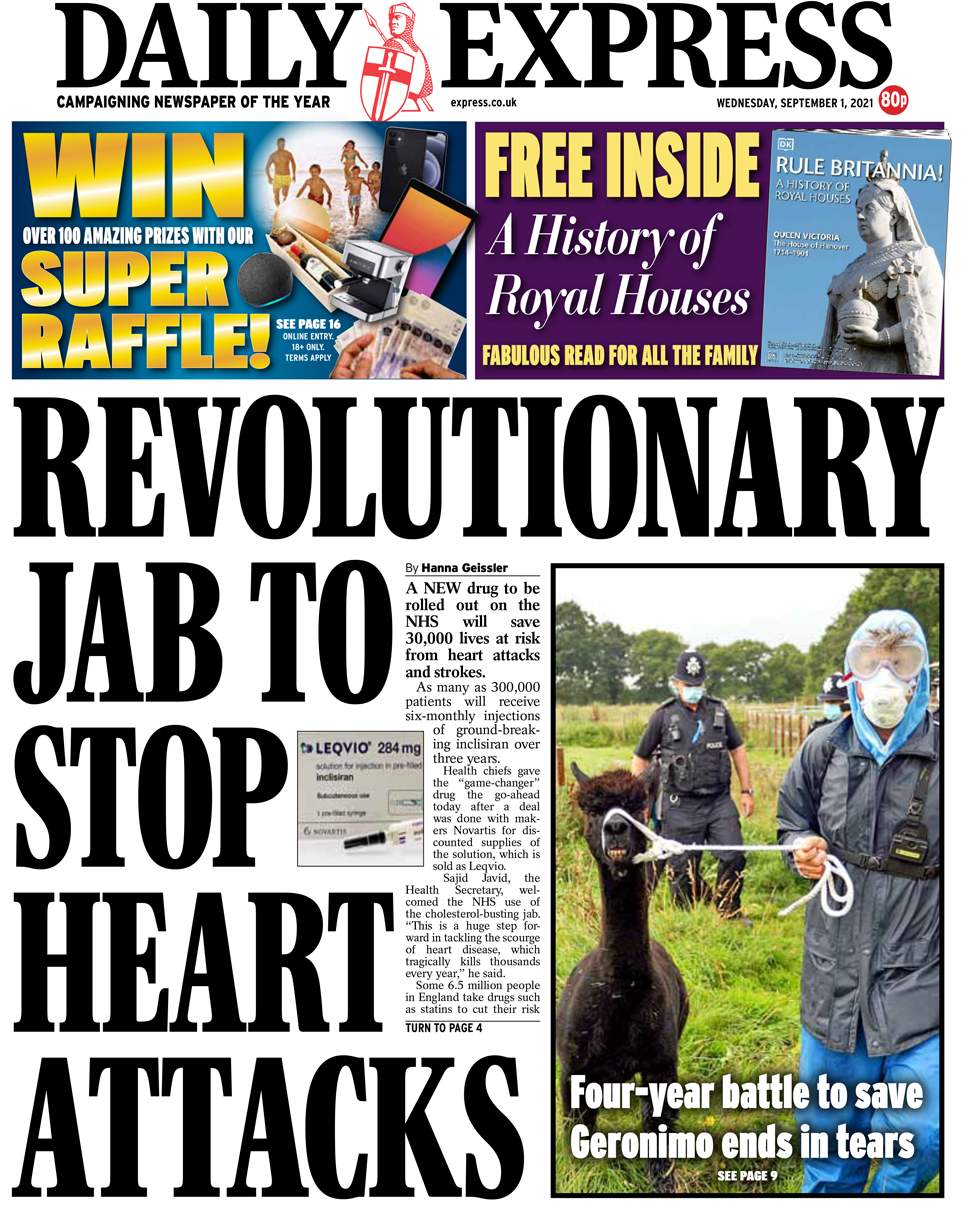 Η Daily Express αναφέρει εκτενώς τα σχέδια του NHS στην Αγγλία και την Ουαλία για την κυκλοφορία του νέου αυτού φαρμάκου που μειώνει τη χοληστερόλη λέγοντας ότι οι επικεφαλής της υγείας περιέγραψαν το φάρμακο ως “αυτό που αλλάζει τα δεδομένα” και το οποίο έλαβε το πράσινο φως μετά από μια συμφωνία με τους κατασκευαστές Novartis για μειωμένες προμήθειες, προσθέτει η εφημερίδα.