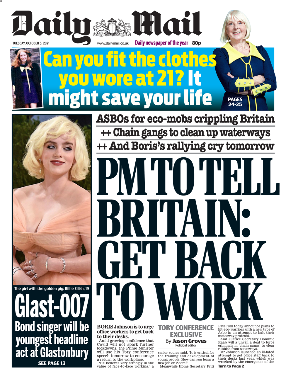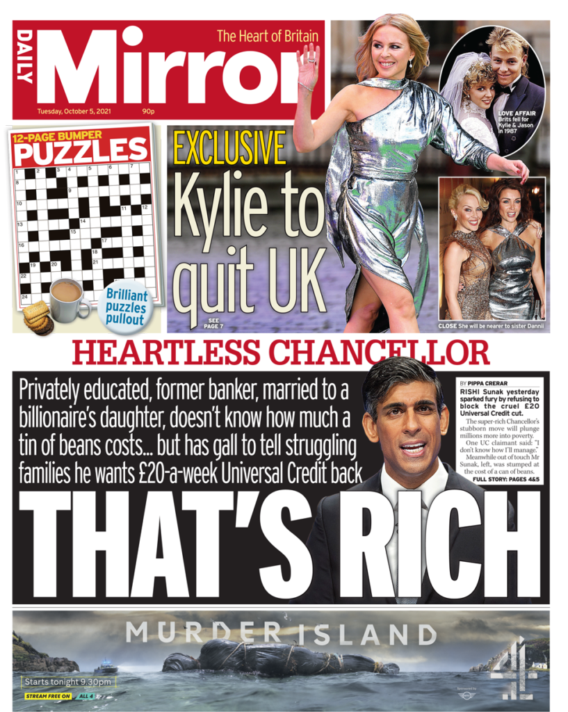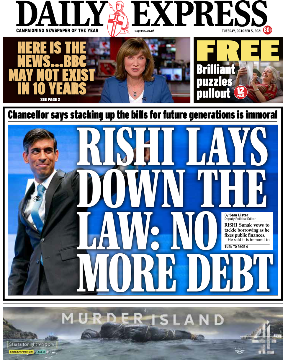 «Ο Rishi αποφασίζει: δεν υπάρχει άλλο χρέος» είναι ο τίτλος της Daily Express. Ο Καγκελάριος παραδέχτηκε ότι η αύξηση των φόρων είναι «αντιδημοφιλής», αλλά πρόσθεσε: «Θέλω φορολογικές περικοπές, αλλά, τα οικονομικά μας πρέπει να τεθούν σε βιώσιμη βάση». Παρόλο που από τότε που ανέλαβε τα ηνία του Υπουργείου Οικονομικών εβδομάδες, πριν χτυπήσει η πανδημία, έχει ξοδέψει 400 δις £, για να ενισχύσει την οικονομία και να προστατεύσει θέσεις εργασίας, είπε στους εκπροσώπους του κόμματος στο Μάντσεστερ ότι η φορολογική ευθύνη σε συνδυασμό με το να το κάνει αυτό, ήταν στο επίκεντρο όλων των αποφάσεών του. «Το να δανειζόμαστε περισσότερα χρήματα και να στοιβάζουμε λογαριασμούς για να πληρώσουν οι επόμενες γενιές δεν είναι μόνο οικονομικά ανεύθυνο, είναι ανήθικο. Επειδή δεν είναι χρήματα του κράτους, είναι δικά σας».