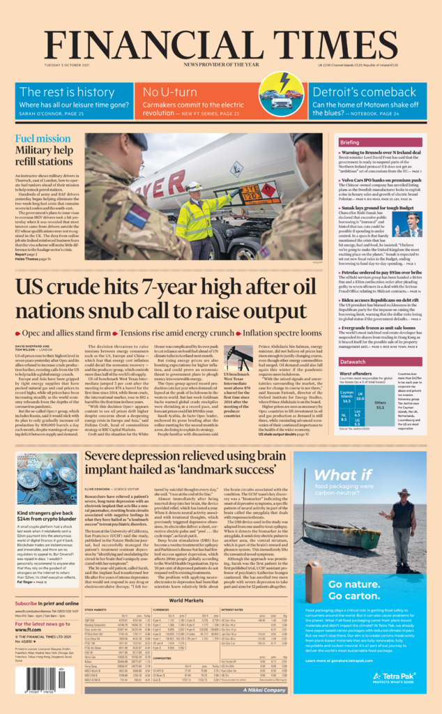 Οι τιμές του αμερικανικού πετρελαίου στο υψηλότερο επίπεδο των επτά τελευταίων ετών είναι το κύριο θέμα των Financial Times, ενώ η βασική φωτογραφία της εφημερίδας περιγράφει την κρίση καυσίμων στο Ηνωμένο Βασίλειο, δείχνοντας έναν εκπαιδευτή να διδάσκει οδηγούς του στρατού, πώς να χειρίζονται βυτιοφόρα. Το σχέδιο του Whitehall για την έκδοση βίζας σε ξένους οδηγούς φορτηγών για την ανακούφιση των προβλημάτων της εφοδιαστικής αλυσίδας έχει «κολλήσει», σύμφωνα με τους Financial Times. Δεδομένα από το site αναζήτησης εργασίας, Indeed, αποκάλυψε ότι το μεγαλύτερο ενδιαφέρον για το προσωρινό πρόγραμμα προήλθε από οδηγούς εκτός Ευρωπαϊκής Ένωσης, των οποίων τα προσόντα δεν αναγνωρίζονται στο Ηνωμένο Βασίλειο.