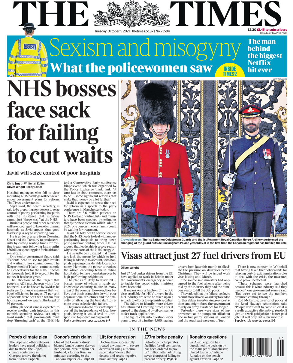 Οι Times γράφουν ότι η ομιλία του υπουργού Υγείας Sajid Javid την Τρίτη θα αποκαλύψει ένα νέο σχεδιασμό για τον έλεγχο των νοσοκομείων που έχουν κακές επιδόσεις και οι διευθυντές νοσοκομείων στην Αγγλία που αποτυγχάνουν να λύσουν τις αυξανόμενες εκκρεμότητες του NHS θα απολυθούν μετά το τέλος της πανδημίας, σύμφωνα με κυβερνητικά σχέδια. Η εφημερίδα επισημαίνει ότι ο κ. Javid θα παροτρύνει επιχειρηματίες και ξένους να βρουν δουλειά στα νοσοκομεία, με τον υπουργό Υγείας να πιστεύει ότι, η καλή ηγεσία είναι το κλειδί για τη βελτίωση της περίθαλψης. Η εφημερίδα αναφέρει ότι ο ίδιος ο κ. Javid δέχεται πίεση από την κυβέρνηση και το Υπουργείο Οικονομικών για αποτελέσματα μειώνοντας τους χρόνους αναμονής, μετά το σχέδιο 36 δις λιρών του περασμένου μήνα για την υγεία και την κοινωνική περίθαλψη. Οι Times αναφέρουν ότι μόλις 27 οδηγοί βυτιοφόρων καυσίμων από την Ευρωπαϊκή Ένωση έχουν υποβάλει αίτηση για εργασία στη Βρετανία, πολύ λιγότερο από τις 300 βίζες που έχουν διατεθεί. Υπάρχει ανησυχία στο Whitehall που πιστεύει πως με την πολιτική απόφαση για τη χαλάρωση των κανόνων για έλεγχο των μεταναστών μετά το Brexit, τα μέτρα θα μπορούσαν να αποδειχθούν αναποτελεσματικά.