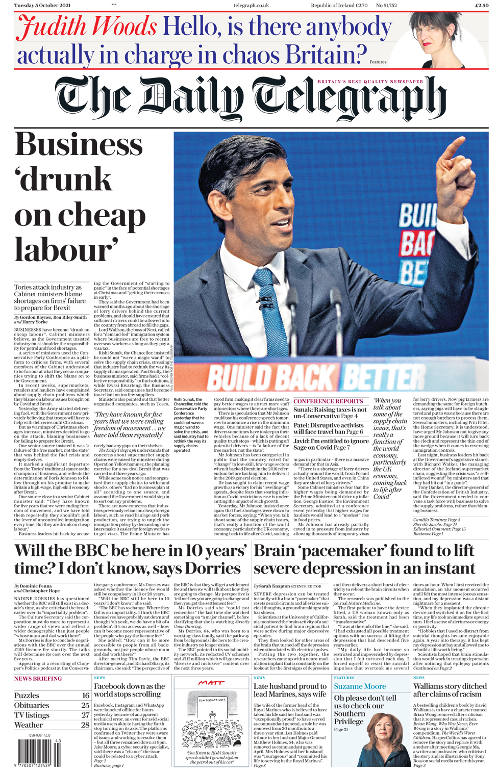 Μια φωτογραφία του καγκελαρίου Rishi Sunak από τη διάσκεψη δημοσιεύει η Daily Telegraph, καθώς το κύριο θέμα της εφημερίδας σημειώνει ότι μια πηγή κοντά σε μέλος του υπουργικού συμβουλίου κατηγορεί τις επιχειρήσεις πως είναι «εκστασιασμένες από τη φθηνή εργασία». Η εφημερίδα γράφει ότι η κυβέρνηση είναι έξαλλη που η βιομηχανία προσπάθησε να την κατηγορήσει για προβλήματα και ελλείψεις στην αλυσίδα εφοδιασμού. «Ακούτε την ομιλία του Rishi Sunak ενώ εγώ πηγαίνω και βγάζω βενζίνη από το αυτοκίνητό του», είναι η λεζάντα που συνοδεύει τη γελοιογραφία του Matt, καθώς η εφημερίδα καλύπτει τις δηλώσεις του καγκελάριου στο συνέδριο του Συντηρητικού Κόμματος για την κρίση της εφοδιαστικής αλυσίδας.