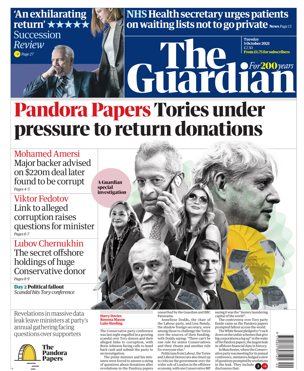 “Οι Tories υπό πίεση για επιστροφή δωρεών” είναι ο τίτλος για τη συνεχιζόμενη αποκάλυψη των Pandora Papers από την Guardian, τη μεγαλύτερη διαρροή μέχρι τώρα των οικονομικών μυστικών των πλουσίων. Η εφημερίδα αναφέρει ότι ένας υποστηρικτής των Tories προέβη σε συμφωνία 220 εκατομμυρίων δολαρίων που αργότερα διαπιστώθηκε ότι ήταν αποτέλεσμα διαφθοράς, άλλος δωρητής έχει τεράστια offshore περιουσία και η σχέση ενός άλλου με τη φερόμενη διαφθορά “εγείρει ερωτήματα για τον υπουργό”.