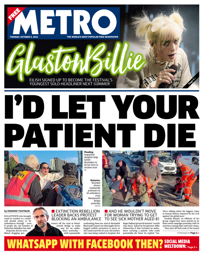 Η πρώτη σελίδα της Metro επικεντρώνεται στα σχόλια του ιδρυτή του Extinction Rebellion, Roger Hallam, για διαμαρτυρίες των περιβαλλοντικών ακτιβιστών που έκλεισαν τους δρόμους στις διαδηλώσεις του Insulate Britain. “Θα άφηνα τον ασθενή σου να πεθάνει” είναι η σύνοψη της εφημερίδας στην απάντησή του σε ερωτήσεις σχετικά με το αν θα υποστήριζε το κλείσιμο δρόμων ακόμη και αν ένα ασθενοφόρο μετέφερε βαριά άρρωστο ασθενή. Ο Roger Hallam είπε ότι οι διαδηλωτές θα πρέπει να συνεχίσουν τις διαμαρτυρίες τους, ακόμα κι αν αυτό σήμαινε ότι ασθενοφόρα δεν θα μπορούσαν να οδηγήσουν έναν ασθενή που πέθαινε στο νοσοκομείο.