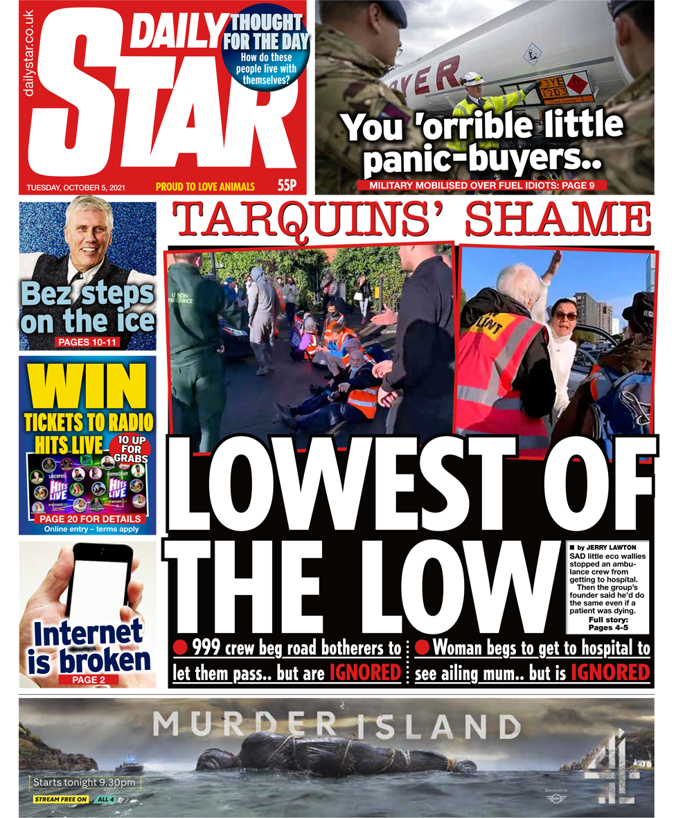“Το χαμηλότερο από τα χαμηλά” είναι ο χαρακτηρισμός των διαδηλωτών από την Daily Star, οι οποίοι φέρεται να σταμάτησαν ένα ασθενοφόρο κατά τη διάρκεια αποκλεισμού στο νότιο Λονδίνο τη Δευτέρα, καθώς και μια γυναίκα που οδηγούσε τη μητέρα της στο νοσοκομείο. Εν τω μεταξύ, η υπουργός Εσωτερικών, Priti Patel, θα ανακοινώσει σήμερα τα σχέδιά της να αντιμετωπίσει τους ακτιβιστές, σε μια προσπάθεια να σταματήσουν τις διαμαρτυρίες τους στους αυτοκινητόδρομους.