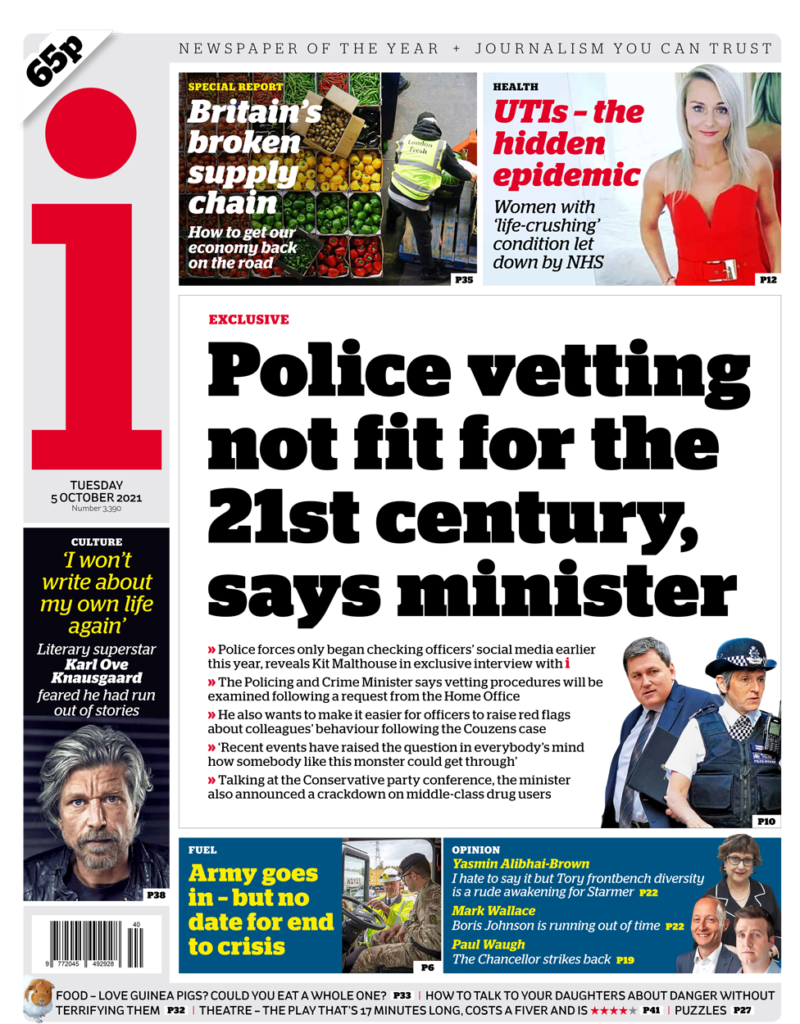 Η εφημερίδα i επιστρέφει στις συνέπειες της δολοφονίας της Sarah Everard από τον αστυνομικό Wayne Couzens, με τον υπουργό Αστυνομίας και Εγκλήματος, Kit Malthouse, να λέει στην εφημερίδα ότι ο έλεγχος της αστυνομίας δεν είναι σύγχρονος για τον 21ο αιώνα και πρέπει να αναθεωρηθεί, ενώ όπως τονίζει, η Scotland Yard άρχισε να ελέγχει τους λογαριασμούς των αστυνομικών στα μέσα κοινωνικής δικτύωσης, μόλις νωρίτερα φέτος. Ο Kit Malthouse είπε ότι ήταν μια «έκπληξη» όταν το έμαθε, αλλά τόνισε τη σιγουριά του ότι τα πρότυπα ελέγχου είναι όσο το δυνατόν υψηλότερα γινόταν.