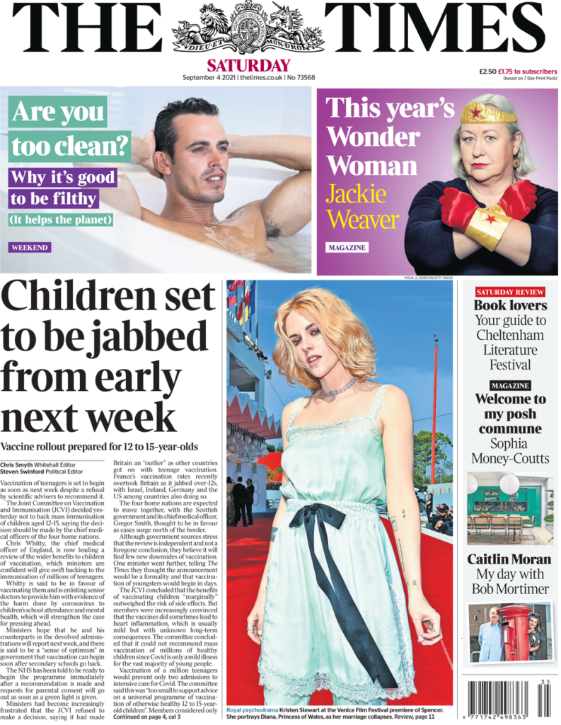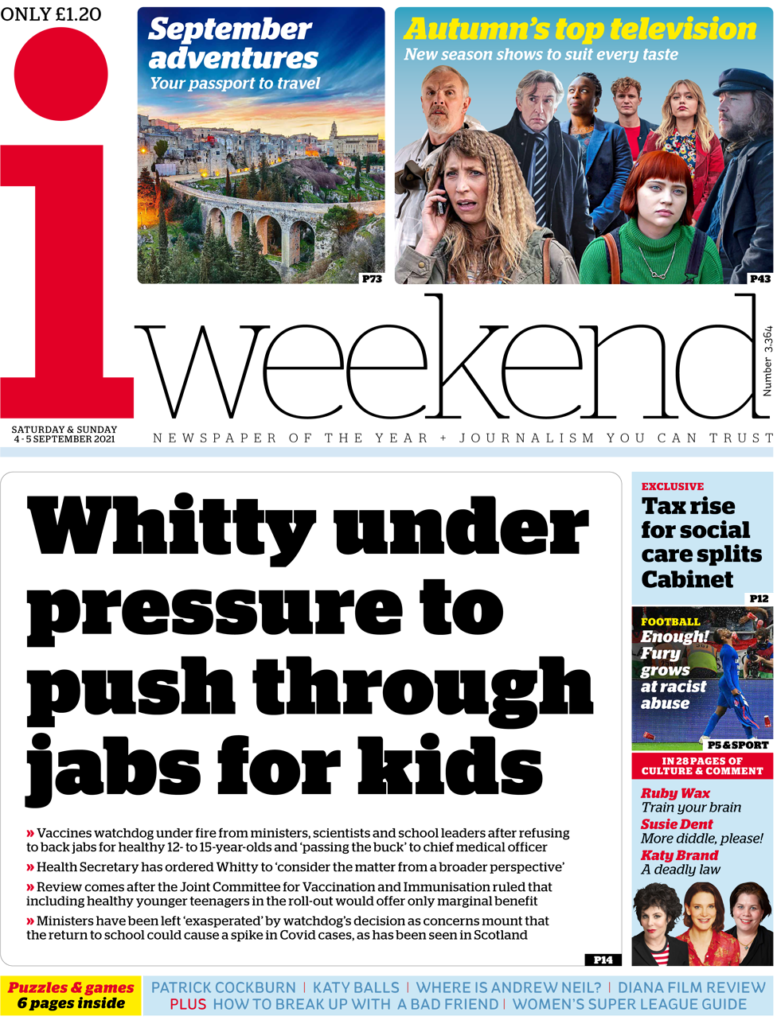 Αναφερόμενη στον εμβολιασμό των μαθητών, η εφημερίδα i του Σαββατοκύριακου, αποκαλύπτει ότι ο καθηγητής Whitty “βρίσκεται υπό πίεση για να προωθήσει” το πρόγραμμα. Το JCVI δέχεται πυρά από υπουργούς, επιστήμονες και διευθυντές σχολείων, διότι αρνήθηκε να υποστηρίξει τον εμβολιασμό σε αυτό το κομμάτι του πληθυσμού και «δίνουν την ευθύνη» στον καθηγητή Whitty, προσθέτει η εφημερίδα. Ο κ. Javid είπε στον επικεφαλής ιατρό να «εξετάσει το θέμα από μια ευρύτερη προοπτική». Γράφοντας στην εφημερίδα σχετικά με την αύξηση των εισφορών της Εθνικής Ασφάλισης, η πολιτική συντάκτρια του Spectator, Katy Balls, καταλήγει στο συμπέρασμα ότι ο Boris Johnson παίζει ένα επικίνδυνο πολιτικό στοίχημα, γνωρίζοντας ότι πρέπει να αθετήσει μια υπόσχεση για να εκπληρώσει μια άλλη που ελπίζει ότι θα εξασφαλίσει την υστεροφημία του.