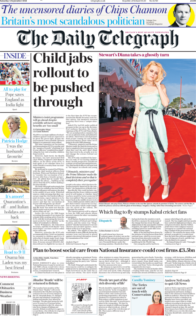 Η Daily Telegraph προσθέτει ότι οι υπουργοί είναι πεπεισμένοι πως ο καθηγητής Whitty και οι άλλοι επικεφαλής ιατροί θα εγκρίνουν το σχέδιο για την χορήγηση των εμβολίων στα παιδιά του σχολείου στα μέσα της επόμενης εβδομάδας. Η εφημερίδα επικαλείται πηγές του Υπουργείου Υγείας λέγοντας ότι ο υπουργός Υγείας, Sajid Javid, “έχει διασφαλίσει ότι το NHS είναι έτοιμο να ξεκινήσει μόλις λάβουμε την οδηγία που θα λέει” Αρχίστε”. Η εφημερίδα εφιστά την προσοχή, λέγοντας ότι η ανάγκη να λαμβάνεται η γονική συναίνεση θα μπορούσε να επιβραδύνει την ταχύτητα του εμβολιασμού. Η Telegraph αναφέρει επίσης ότι τα σχέδια αύξησης των εισφορών της Εθνικής Ασφάλισης για την πληρωμή της κοινωνικής φροντίδας θα μπορούσαν να κοστίσουν στις βρετανικές επιχειρήσεις έως και 3,5 δισ. λίρες ετησίως, ενώ σύμφωνα με την εφημερίδα, το ήμισυ του Υπουργικού Συμβουλίου αντιτίθεται στην ιδέα.